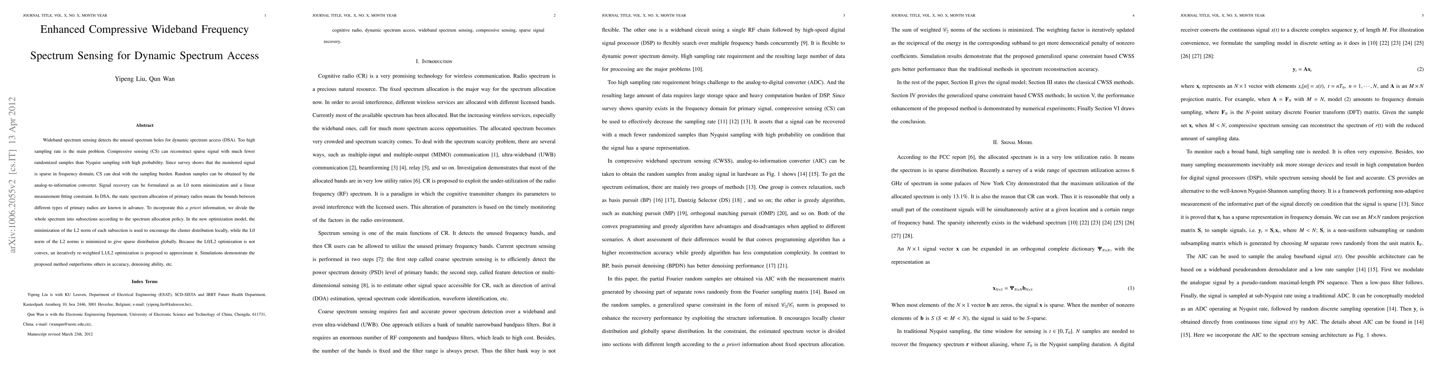 The paper presents an improved sparse constraint model for wideband spectrum sensing that incorporates fixed spectrum allocation information and uses iteratively re-weighted L1/L2 optimization to enhance performance.