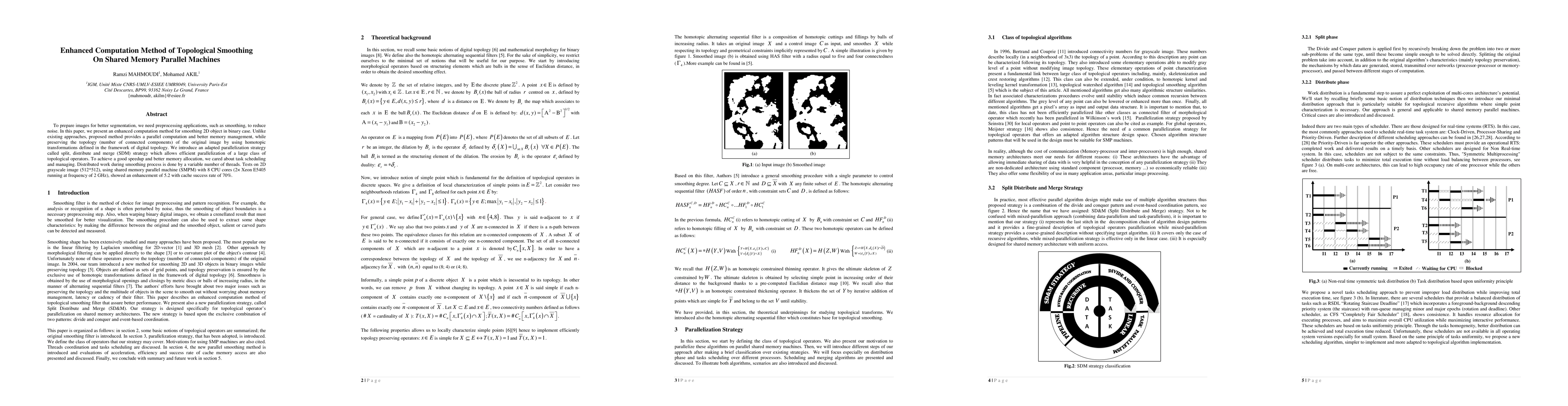 To prepare images for better segmentation, we need preprocessing applications, such as smoothing, to reduce noise. In this paper, we present an enhanced computation method for smoothing 2D object in binary case. Unlike existing approaches, proposed method provides a parallel computation and better memory management, while preserving the topology (number of connected components) of the original image by using homotopic transformations defined in the framework of digital topology. We introduce an adapted parallelization strategy called split, distribute and merge (SDM) strategy which allows efficient parallelization of a large class of topological operators. To achieve a good speedup and better memory allocation, we cared about task scheduling and managing. Distributed work during smoothing process is done by a variable number of threads. Tests on 2D grayscale image (512*512), using shared memory parallel machine (SMPM) with 8 CPU cores (2 Xeon E5405 running at frequency of 2 GHz), showed an enhancement of 5.2 with cache success rate of 70%.