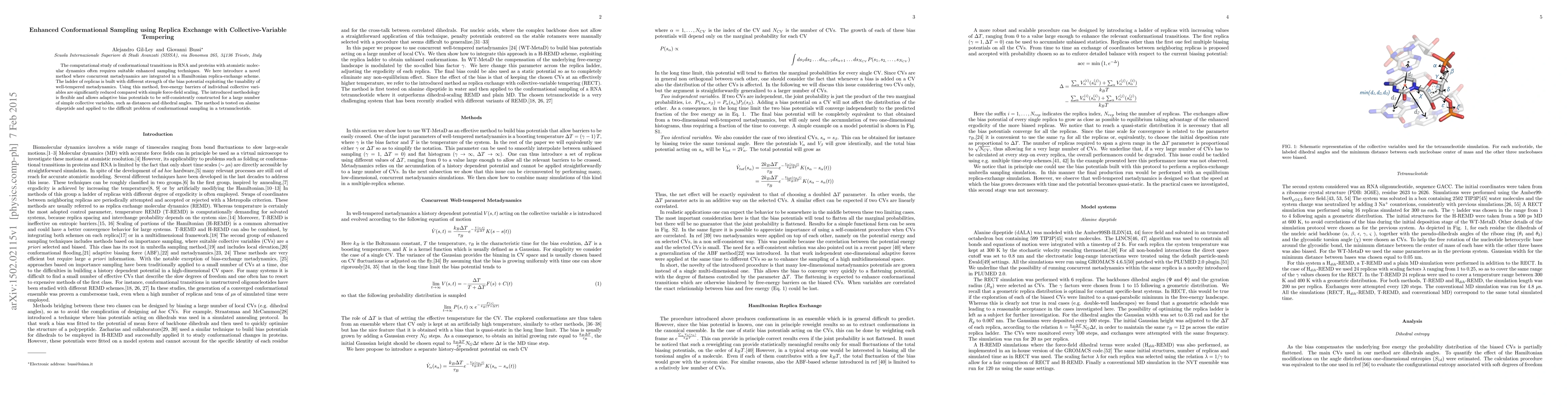 This paper introduces a novel method combining replica exchange with collective-variable tempering and metadynamics to enhance conformational sampling in proteins and RNA. The method effectively reduces free-energy barriers and is flexible for adaptive bias potentials, demonstrated through successful applications on alanine dipeptide and a tetranucleotide.