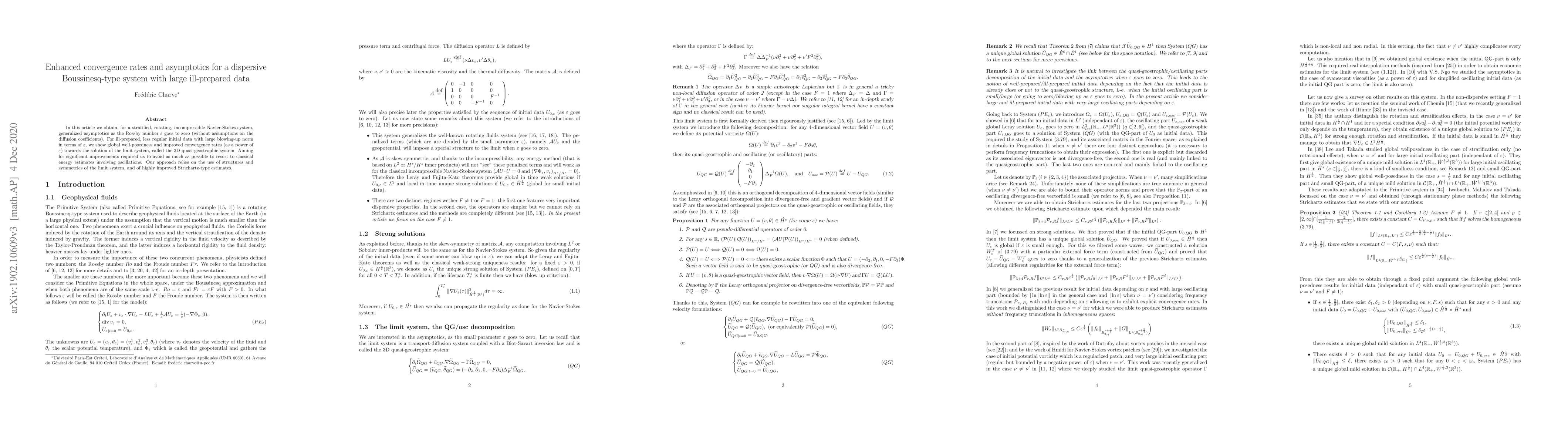 In this article we prove highly improved and flexible Strichartz-type estimates allowing us to generalize the asymptotics we obtained for a stratified and rotating incompressible Navier-Stokes system: for large (and less regular) initial data, we obtain global well-posedness, asymptotics (as the Rossby number $\epsilon$ goes to zero) and convergence rates as a power of the small parameter $\epsilon$. Our approach is lead by the special structure of the limit system: the 3D quasi-geostrophic system.