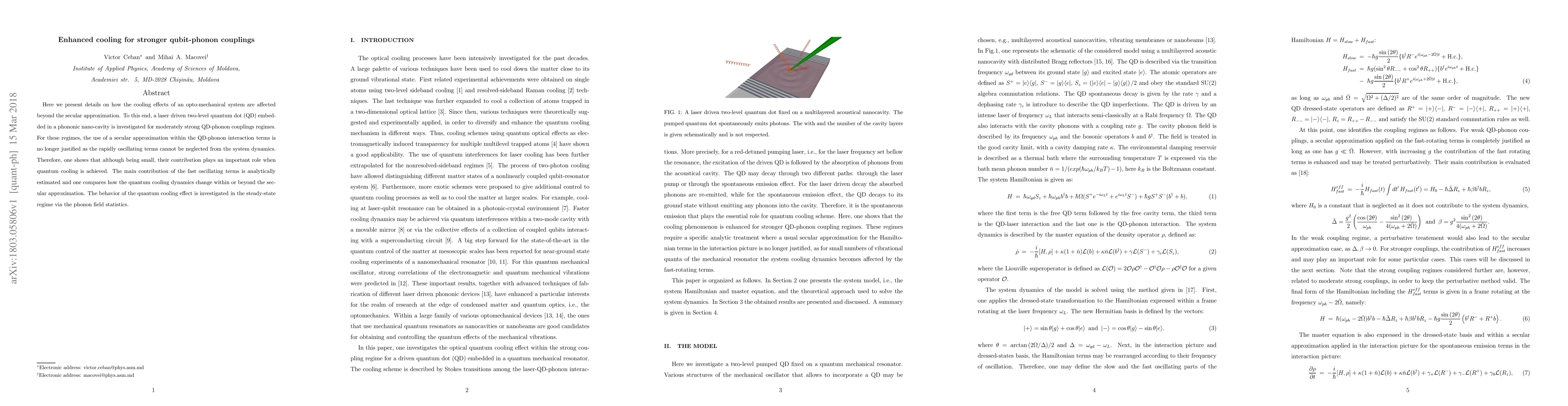 Here we present details on how the cooling effects of an opto-mechanical system are affected beyond the secular approximation. To this end, a laser driven two-level quantum dot (QD) embed- ded in a phononic nano-cavity is investigated for moderately strong QD-phonon couplings regimes. For these regimes, the use of a secular approximation within the QD-phonon interaction terms is no longer justified as the rapidly oscillating terms cannot be neglected from the system dynamics. Therefore, one shows that although being small, their contribution plays an important role when quantum cooling is achieved. The main contribution of the fast oscillating terms is analytically estimated and one compares how the quantum cooling dynamics change within or beyond the sec- ular approximation. The behavior of the quantum cooling effect is investigated in the steady-state regime via the phonon field statistics.