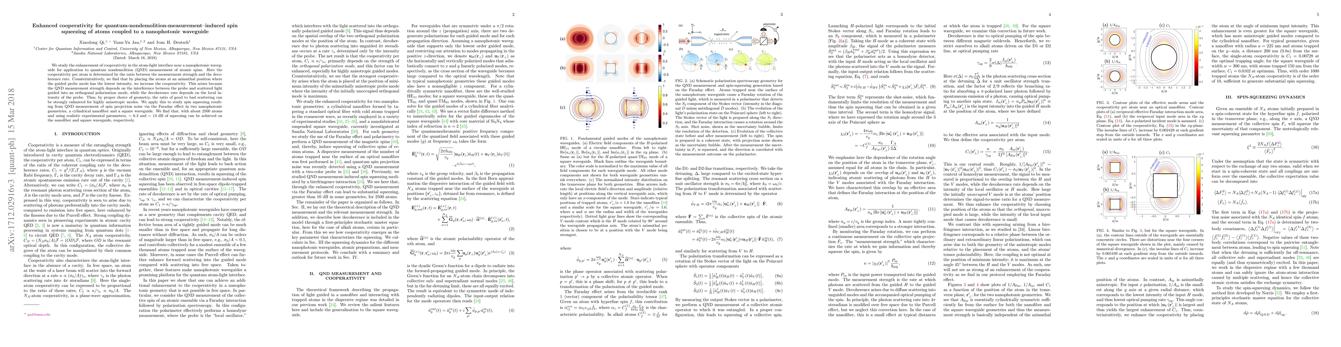 This paper investigates how cooperativity in atom-light interactions near a nanophotonic waveguide can be enhanced for quantum nondemolition measurement of atomic spins, achieving spin squeezing. Surprisingly, positioning atoms where the probe mode has minimal intensity boosts cooperativity, leading to up to 13 dB of spin squeezing in a square waveguide with 2500 atoms.