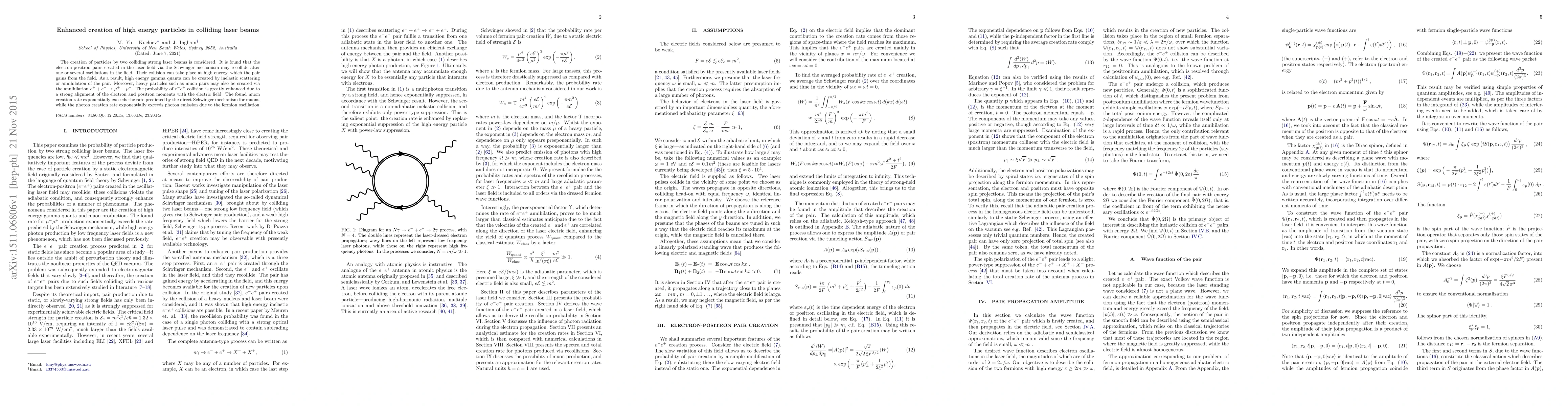 This research explores the enhanced production of high-energy particles, including gamma quanta and muon pairs, via the collision of two strong laser beams. The study finds that electron-positron pairs created through the Schwinger mechanism can recollide at high energies, leading to the creation of heavy particles and significantly higher gamma quanta rates than predicted by conventional mechanisms.