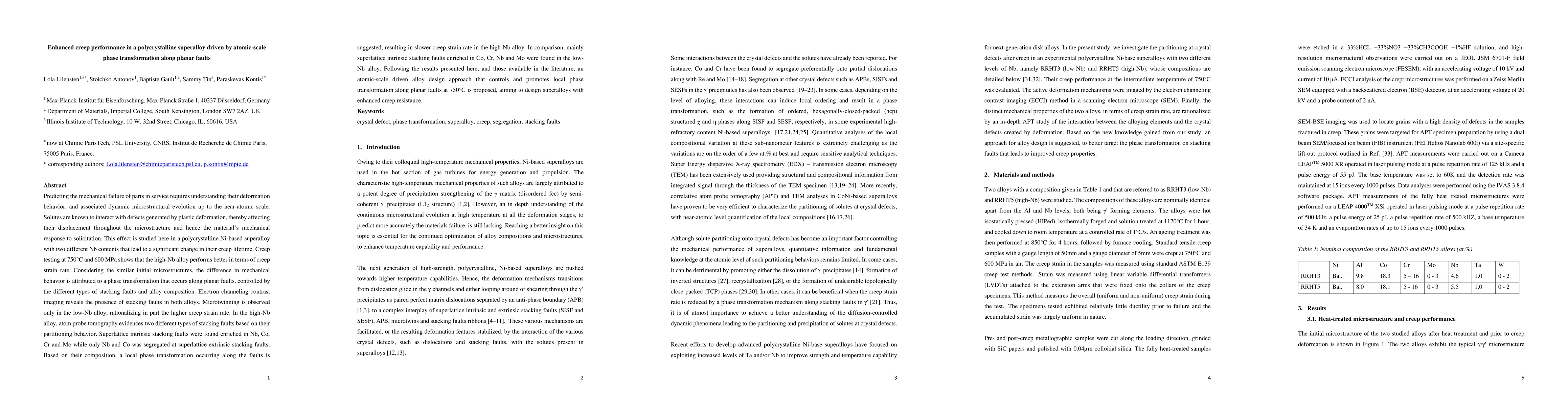 This study investigates the enhanced creep performance in a polycrystalline Ni-based superalloy, attributing the improved creep strain rate in high-Nb content alloy to atomic-scale phase transformation along planar faults, driven by solute partitioning and segregation in different stacking faults. An atomic-scale driven alloy design approach is proposed to promote such transformations for superior creep resistance.