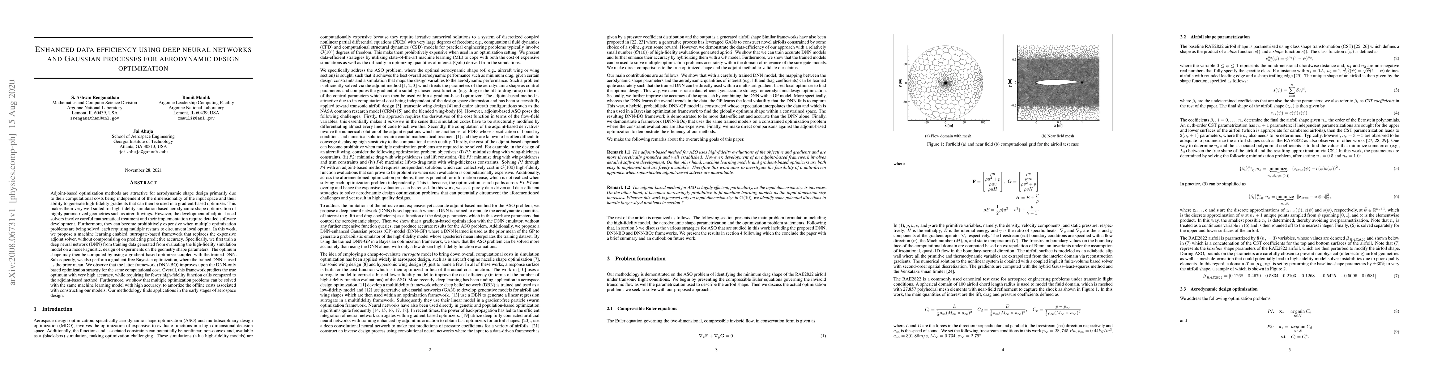This paper proposes a machine learning-enabled framework for aerodynamic shape optimization that uses deep neural networks (DNNs) and Gaussian processes to replace expensive adjoint solvers. The DNN is trained on high-fidelity simulation data, enabling gradient-based optimization and Bayesian optimization, which significantly reduces computational costs while maintaining high predictive accuracy.