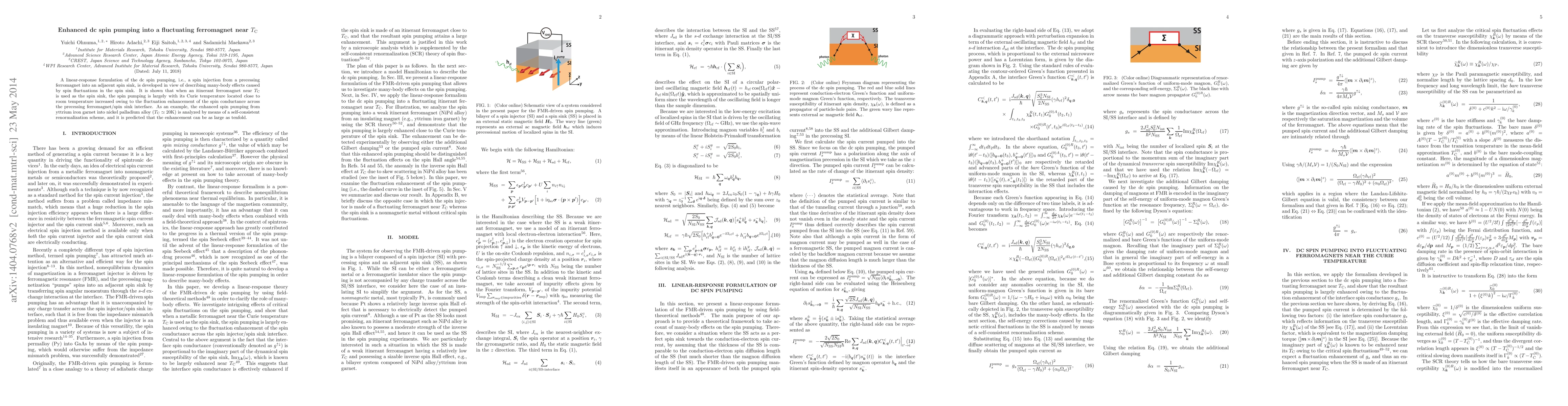 A linear-response formulation of the dc spin pumping, i.e., a spin injection from a precessing ferromagnet into an adjacent spin sink, is developed in view of describing many-body effects caused by spin fluctuations in the spin sink. It is shown that, when an itinerant ferromagnet near Tc is used as the spin sink, the spin pumping is largely increased owing to the fluctuation enhancement of the spin conductance across the precessing ferromagnet/spin sink interface. As an example, the enhanced spin pumping from permalloy into nickel palladium alloy (Tc ~ 20K) is analyzed by means of a self-consistent renormalization scheme, and it is predicted that the enhancement can be as large as tenfold.