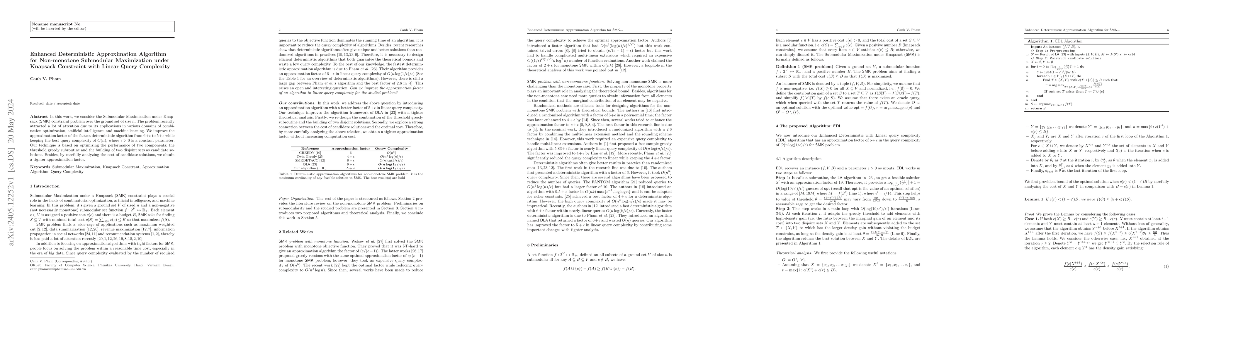 This paper presents an enhanced deterministic algorithm that improves the approximation factor for Submodular Maximization under Knapsack Constraint problems from $6+\epsilon$ to $5+\epsilon$, maintaining query complexity at $O(n)$. The technique optimizes threshold greedy and candidate set construction methods for better performance.
