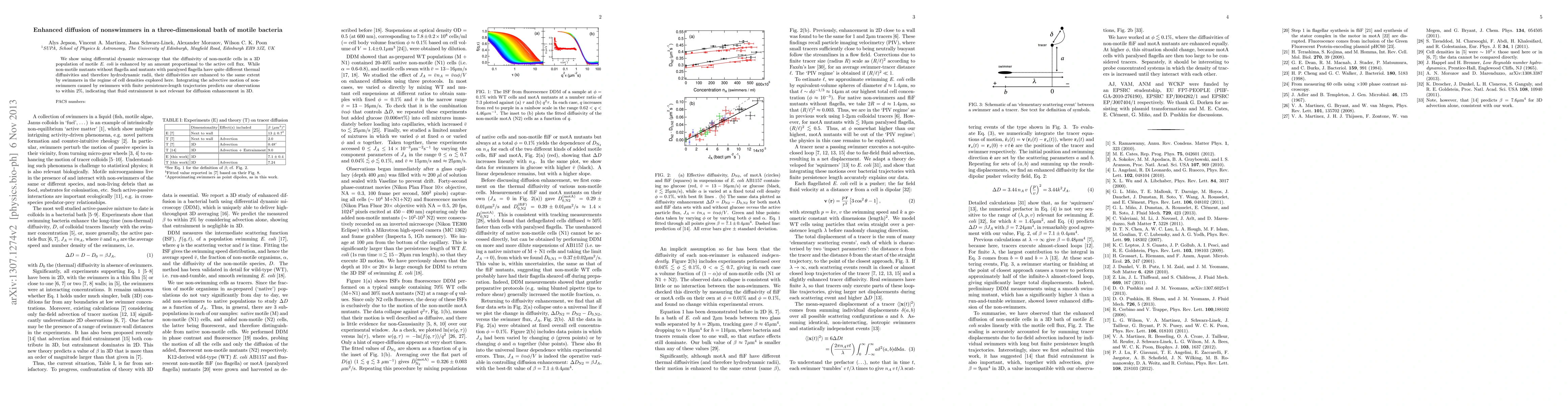 This paper demonstrates that non-motile cells experience enhanced diffusion in a three-dimensional population of motile E. coli, with their diffusivity proportional to the active bacterial flux. The study finds that the diffusion enhancement is consistent across different non-motile mutants, regardless of their hydrodynamic differences, and is primarily due to the advective motion of swimmers rather than fluid entrainment.