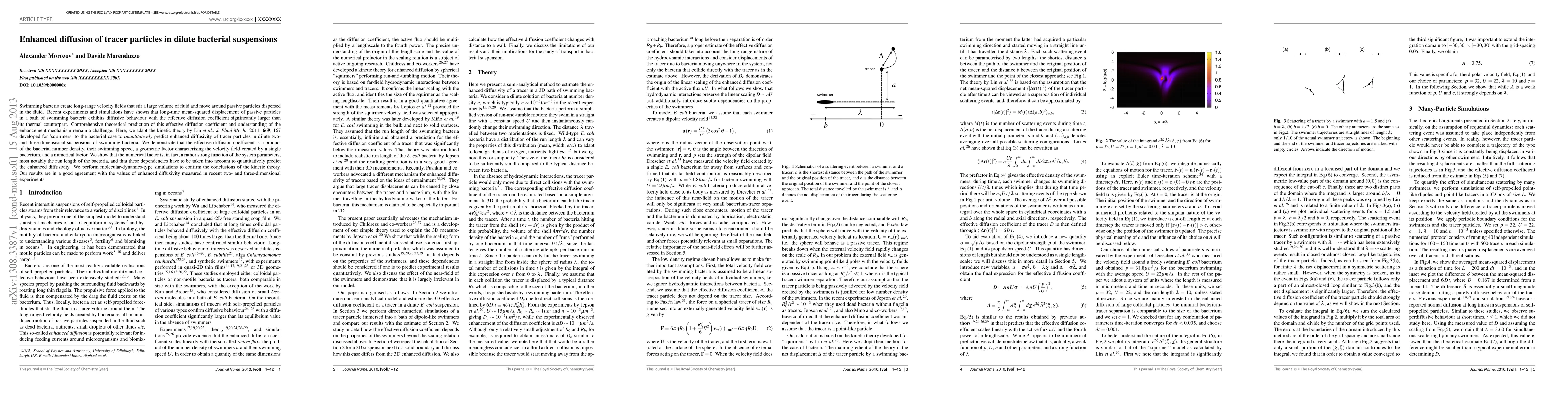The research adapts kinetic theory for 'squirmers' to predict enhanced diffusivity of tracer particles in dilute bacterial suspensions, both in 2D and 3D, using molecular-dynamics-type simulations for validation.