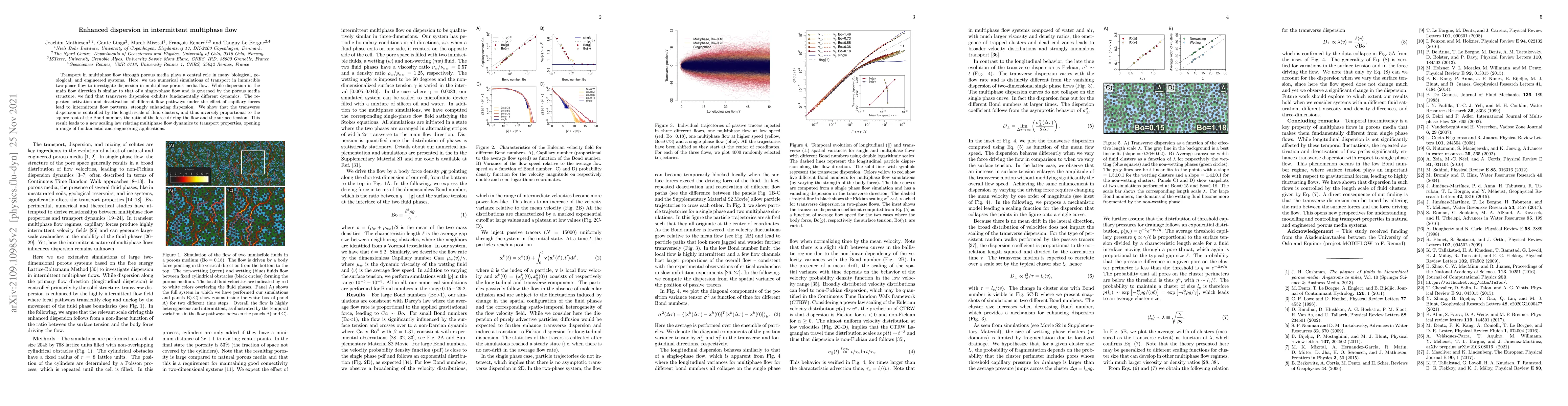This paper investigates enhanced dispersion in multiphase flow through porous media using numerical simulations, revealing that transverse dispersion is significantly influenced by intermittent flow patterns driven by capillary forces, governed by the length scale of fluid clusters and the Bond number. This leads to a new scaling law for multiphase flow dynamics.