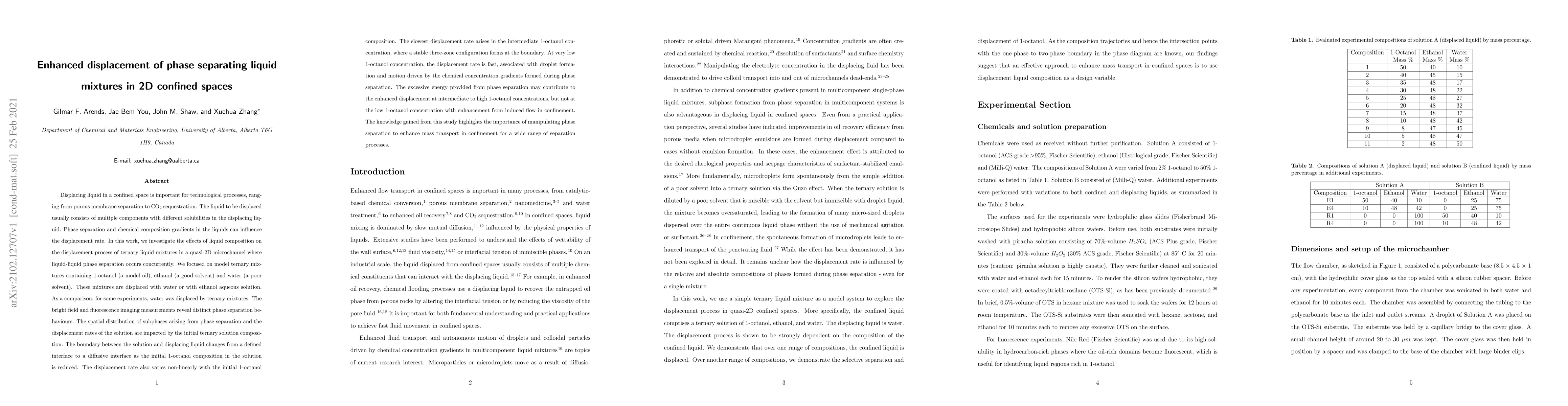 This study investigates the displacement of ternary liquid mixtures in a quasi-2D microchannel, focusing on the effects of liquid composition on the process. The slowest displacement rate occurs at intermediate 1-octanol concentrations due to stable three-zone configurations, while low concentrations lead to fast displacement via droplet formation driven by phase separation.