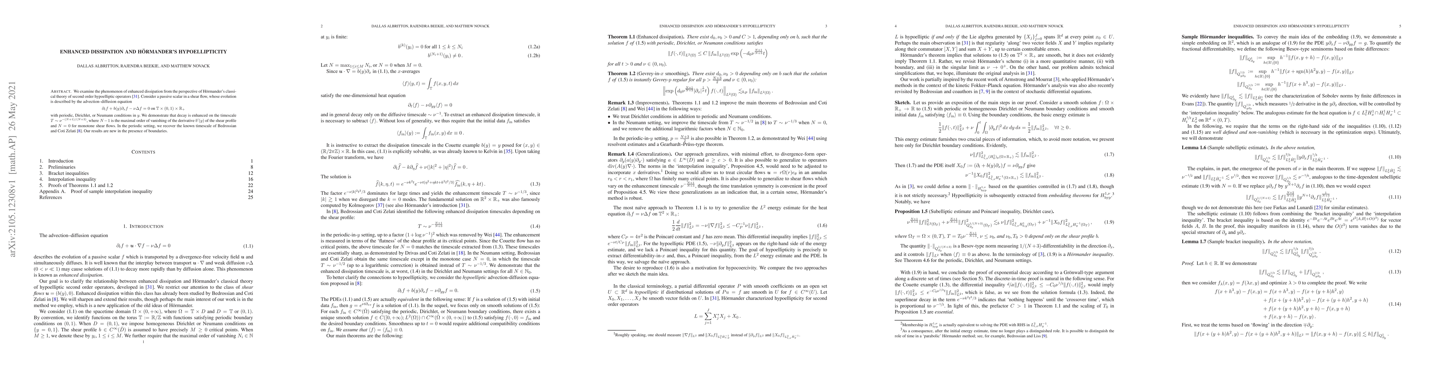 This paper investigates enhanced dissipation in advection-diffusion equations under shear flow, leveraging Hörmander's hypoellipticity theory. It shows that decay is accelerated on a timescale dependent on the shear profile's derivative, with new findings for boundary conditions.