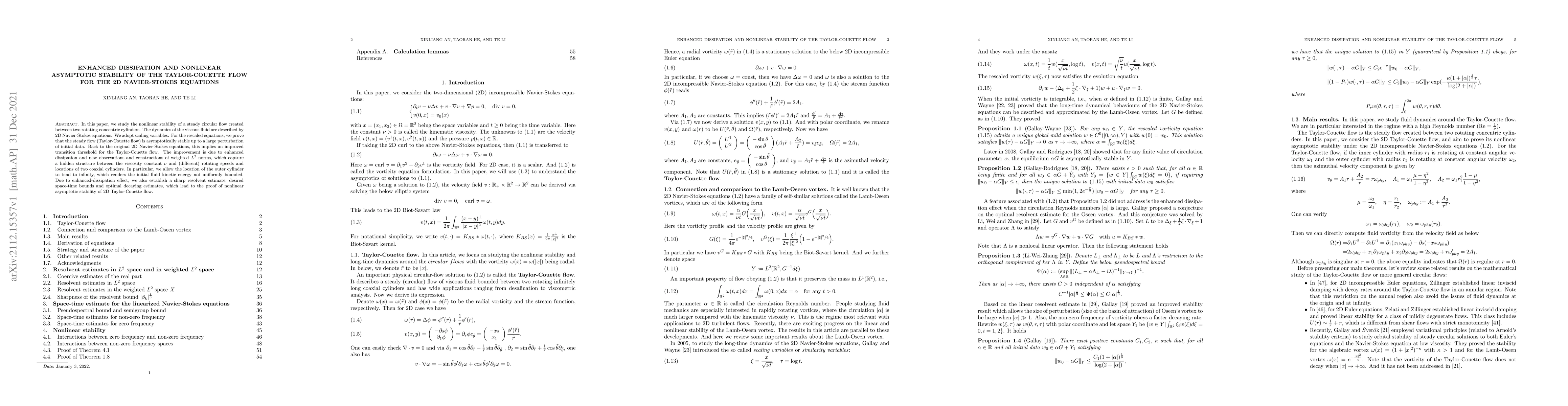 This paper investigates the nonlinear stability of the 2D Taylor-Couette flow described by the Navier-Stokes equations, proving its asymptotic stability under large perturbations. Enhanced dissipation and new weighted $L^2$ norms lead to improved transition thresholds and optimal decay estimates for the flow.