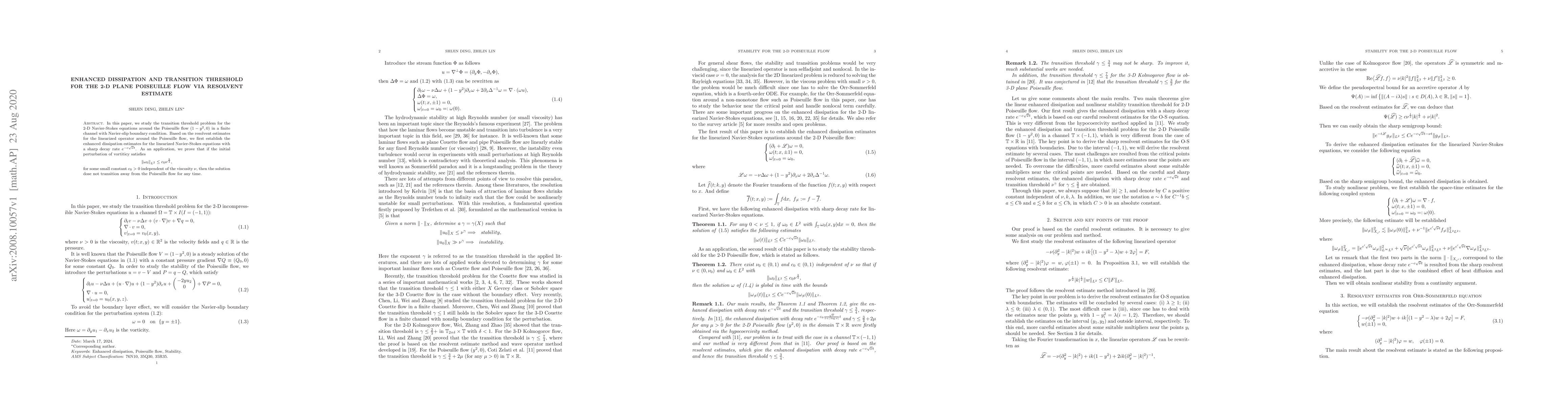 This paper investigates the transition threshold for 2-D Poiseuille flow in Navier-Stokes equations, establishing enhanced dissipation estimates via resolvent estimates. It proves that small initial vorticity perturbations, below a certain threshold, prevent flow transition for any time.
