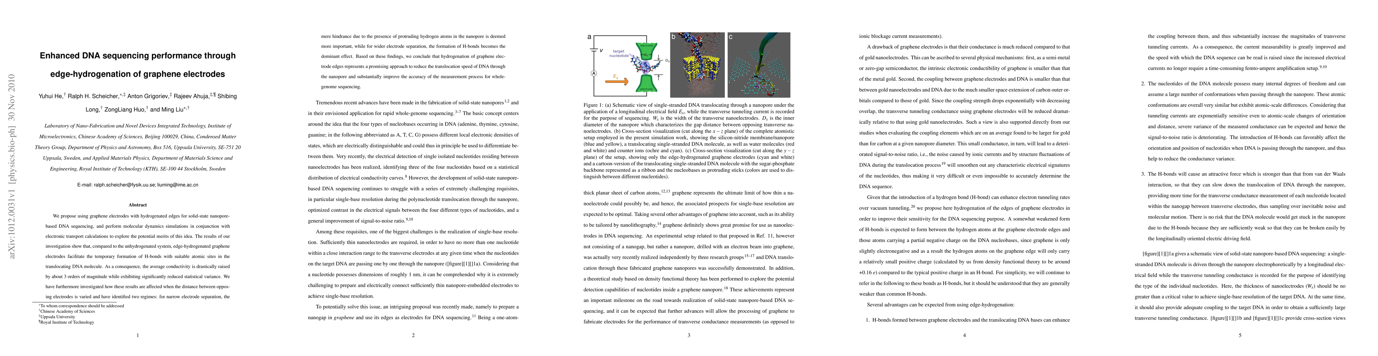 This paper proposes hydrogenated graphene electrodes for enhanced solid-state nanopore DNA sequencing, showing a 3-order increase in conductivity and reduced variance. The study identifies two regimes affecting performance based on electrode separation, suggesting hydrogenation improves sequencing accuracy.
