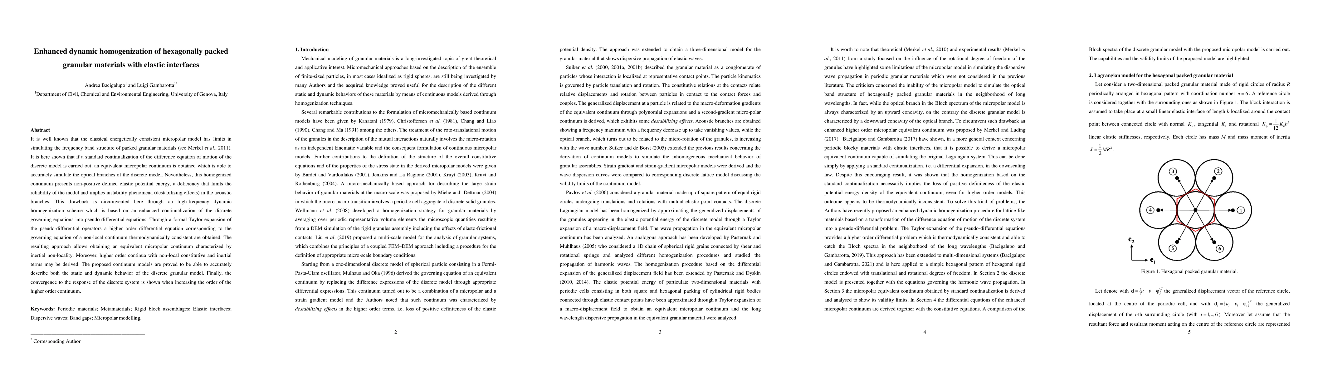 This paper proposes an enhanced dynamic homogenization method to accurately simulate the behavior of hexagonally packed granular materials with elastic interfaces. It introduces an improved continualization technique to derive higher-order non-local continuum models that overcome the limitations of classical micropolar models, achieving better convergence to the discrete granular system's response.