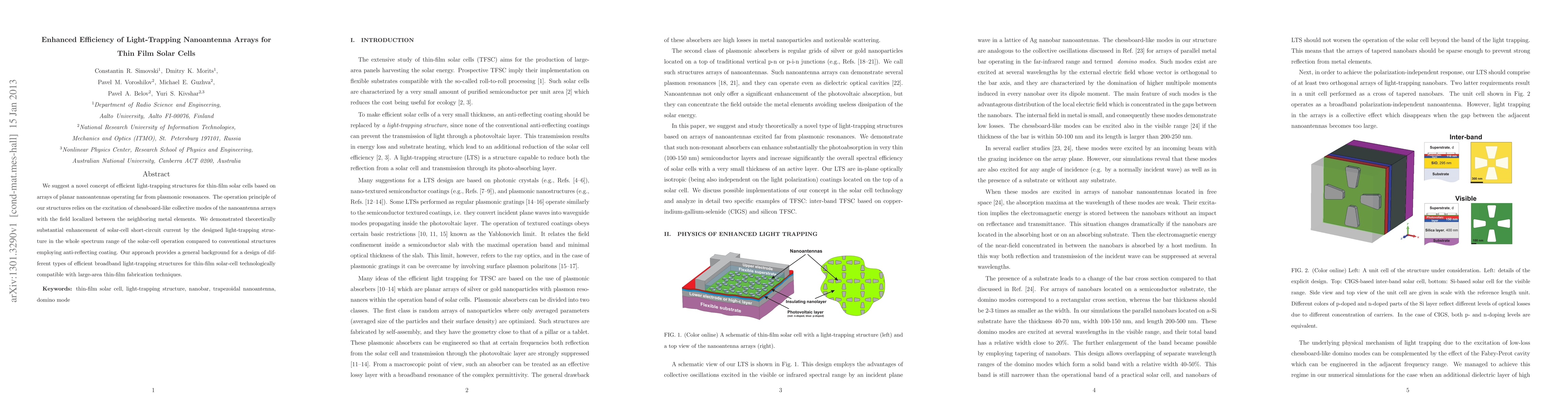 The research proposes a novel concept of light-trapping structures for thin-film solar cells using arrays of planar nanoantennas operating far from plasmonic resonances, exciting chessboard-like collective modes between neighboring metal elements.