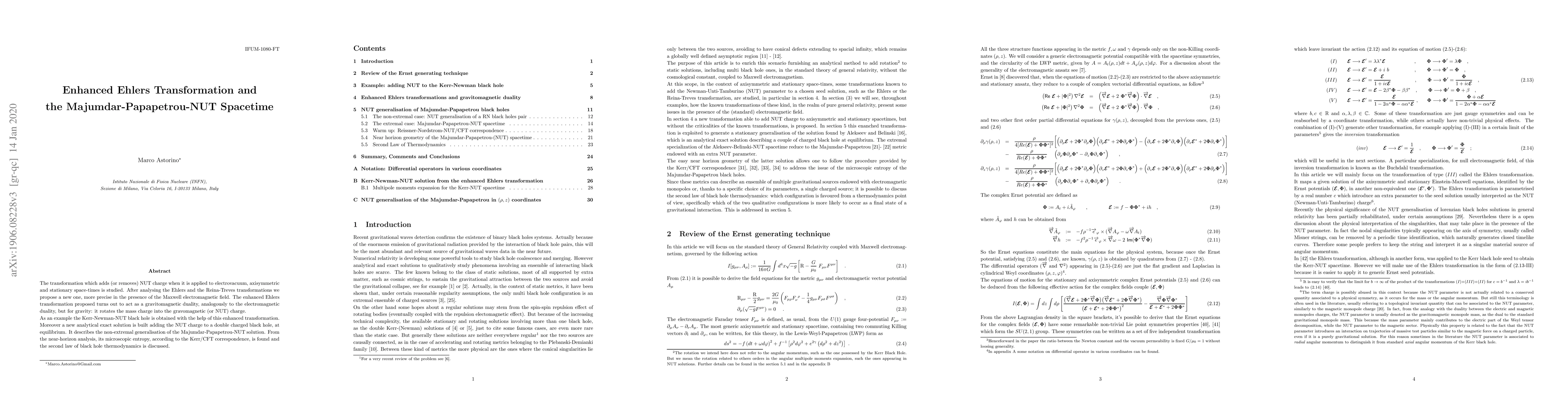 The transformation which adds (or removes) NUT charge when it is applied to electrovacuum, axisymmetric and stationary space-times is studied. After analysing the Ehlers and the Reina-Treves transformations we propose a new one, more precise in the presence of the Maxwell electromagnetic field. The enhanced Ehlers transformation proposed turns out to act as a gravitomagnetic duality, analogously to the electromagnetic duality, but for gravity: it rotates the mass charge into the gravomagnetic (or NUT) charge. As an example the Kerr-Newman-NUT black hole is obtained with the help of this enhanced transformation. Moreover a new analytical exact solution is built adding the NUT charge to a double charged black hole, at equilibrium. It describes the non-extremal generalisation of the Majumdar-Papapetrou-NUT solution. From the near-horizon analysis, its microscopic entropy, according to the Kerr/CFT correspondence, is found and the second law of black hole thermodynamics is discussed.