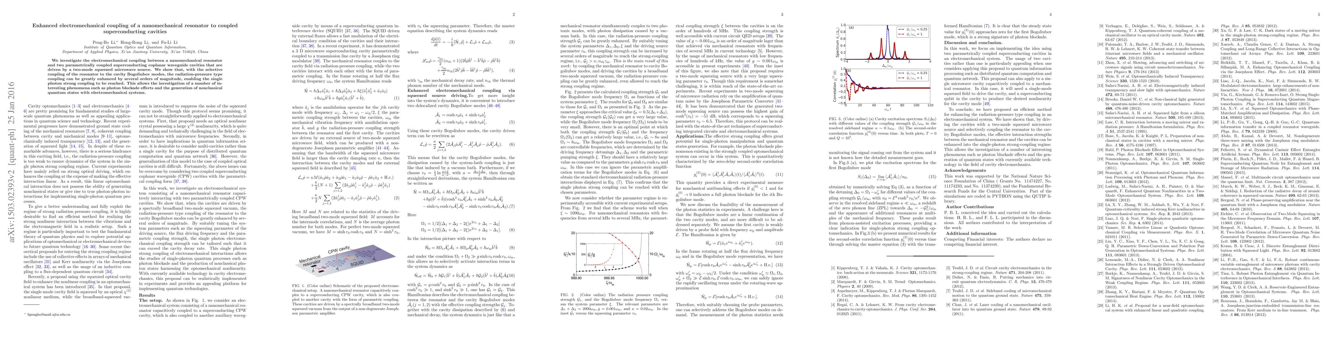 This paper explores enhanced electromechanical coupling between a nanomechanical resonator and two parametrically coupled superconducting cavities, achieving significant amplification through selective coupling to cavity Bogoliubov modes, enabling single photon strong coupling and facilitating studies of quantum phenomena like photon blockade and nonclassical state generation.