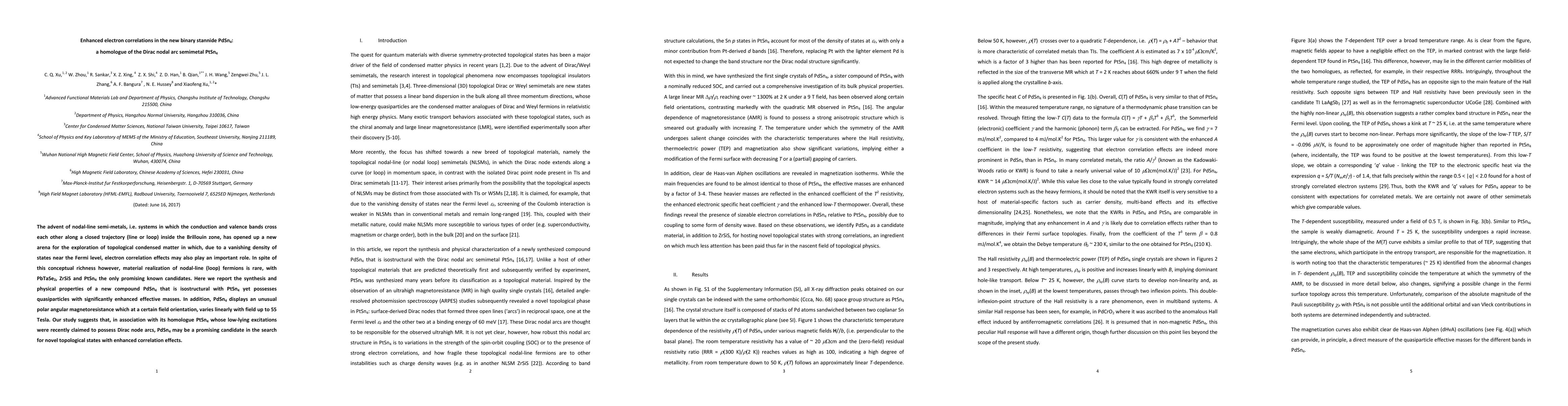 The paper reports the synthesis of PdSn4, a new binary stannide with enhanced electron correlations and unusual polar angular magnetoresistance, suggesting it may exhibit novel topological states akin to its homologue PtSn4, which has Dirac nodal arc semimetal characteristics.
