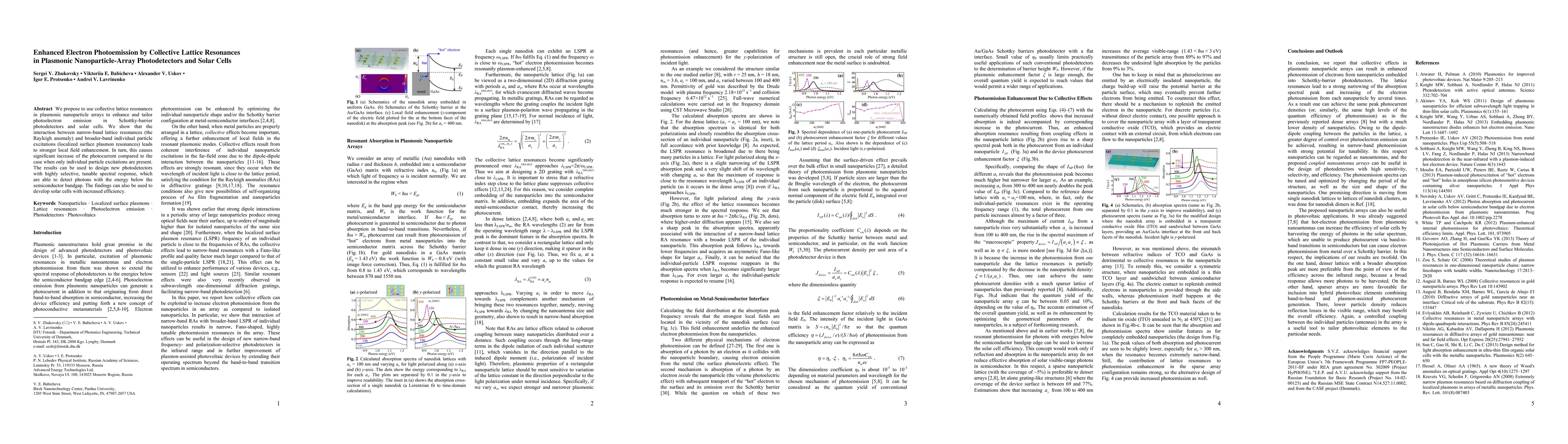 This paper explores using collective lattice resonances in plasmonic nanoparticle arrays to boost electron photoemission in photodetectors and solar cells, showing that combining these resonances with localized surface plasmon resonances significantly enhances photocurrents. This approach can lead to more efficient, tunable devices detecting sub-bandgap photons.