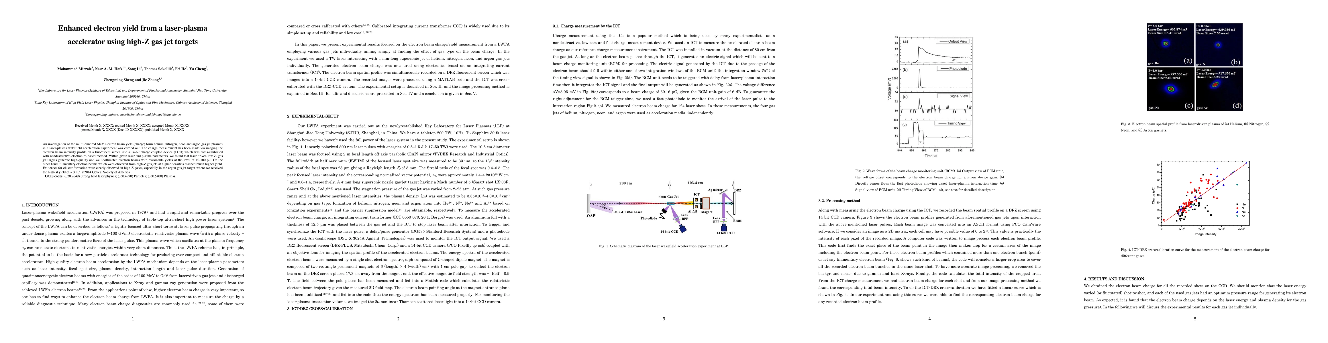 This study investigates electron yield from laser-plasma accelerators using various gas jet targets, finding that high-Z gas jets like argon produce significantly higher yields (~3 nC) compared to low-Z gases like helium, which yield 10-100 pC. Cluster formation evidence in high-Z gases suggests enhanced electron generation mechanisms.
