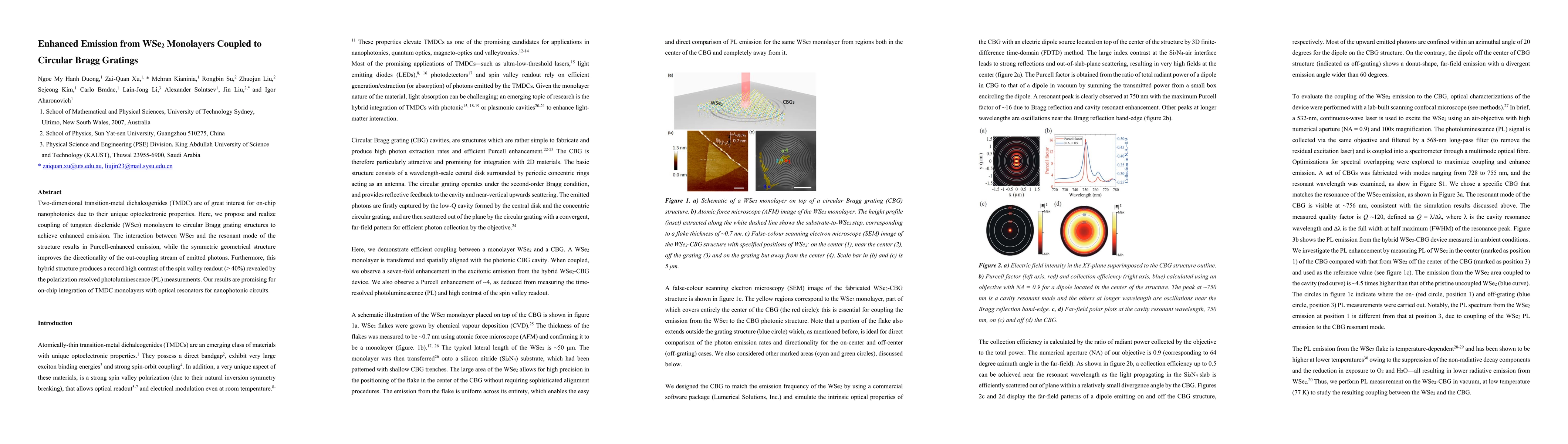 Summary: The study demonstrates enhanced emission from WSe2 monolayers when coupled to circular Bragg gratings, achieving Purcell-enhanced emission and high directionality. The structure also shows a significant spin valley contrast (>40%), indicating potential for on-chip integration in nanophotonic circuits.