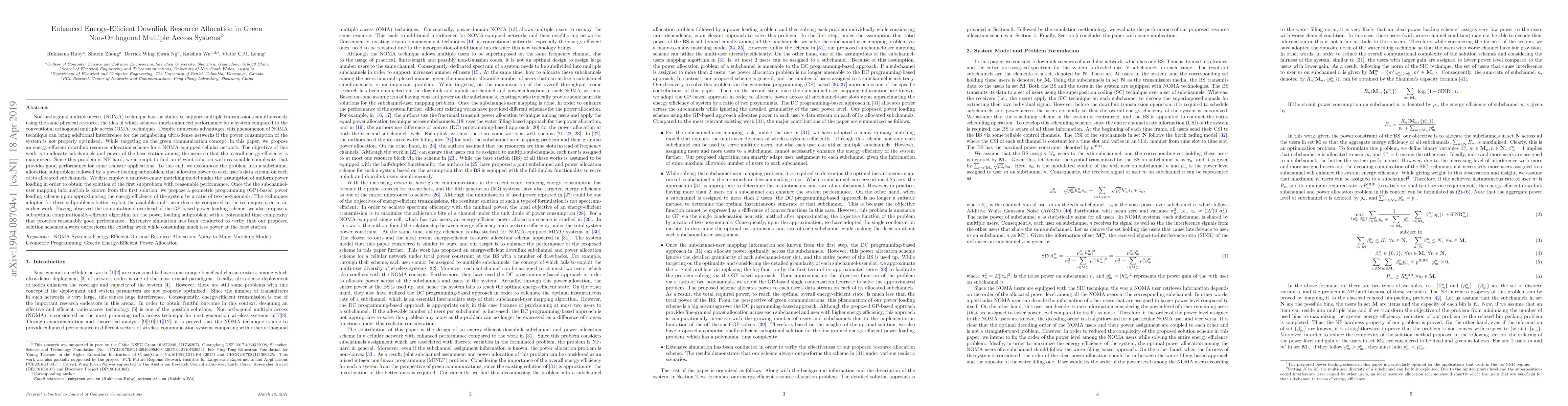 This paper proposes an energy-efficient downlink resource allocation scheme for NOMA-equipped cellular networks to maximize overall energy efficiency. It presents a novel solution using many-to-many matching and geometric programming, which outperforms existing work while consuming less power at the base station.