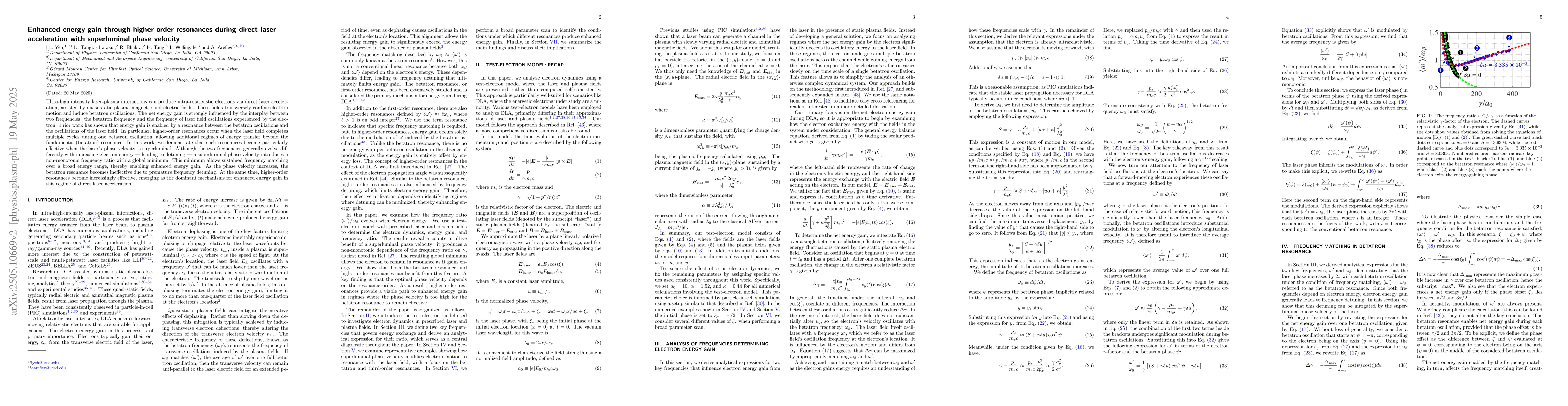 The paper presents a theoretical framework demonstrating that higher-order resonances, facilitated by superluminal phase velocities, can significantly enhance energy gain in direct laser acceleration.
