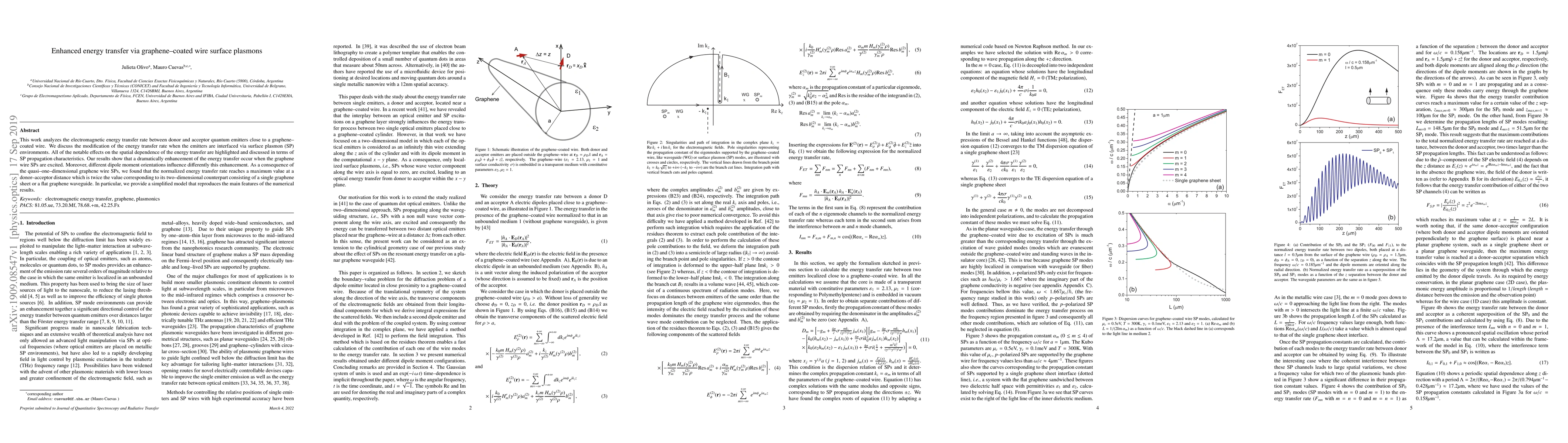 This work analyzes the electromagnetic energy transfer rate between donor and acceptor quantum emitters close to a graphene-coated wire. We discuss the modification of the energy transfer rate when the emitters are interfaced via surface plasmon (SP) environments. All of the notable effects on the spatial dependence of the energy transfer are highlighted and discussed in terms of SP propagation characteristics. Our results show that a dramatically enhancement of the energy transfer occur when the graphene wire SPs are excited. Moreover, different dipole moment orientations influence differently this enhancement. As a consequence of the quasi-one-dimensional graphene wire SPs, we found that the normalized energy transfer rate reaches a maximum value at a donor-acceptor distance which is twice the value corresponding to its two-dimensional counterpart consisting of a single graphene sheet or a flat graphene waveguide. In particular, we provide a simplified model that reproduces the main features of the numerical results.