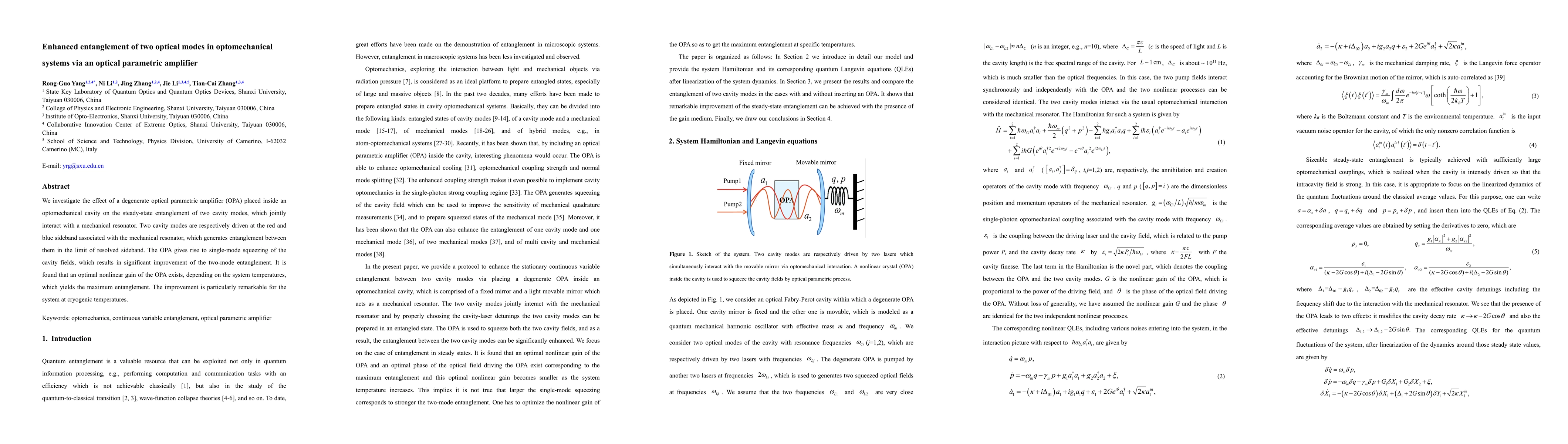 This paper explores how an optical parametric amplifier within an optomechanical cavity enhances the entanglement between two cavity modes interacting with a mechanical resonator. The OPA induces single-mode squeezing, significantly boosting two-mode entanglement, with optimal nonlinear gain yielding maximum entanglement, especially at cryogenic temperatures.