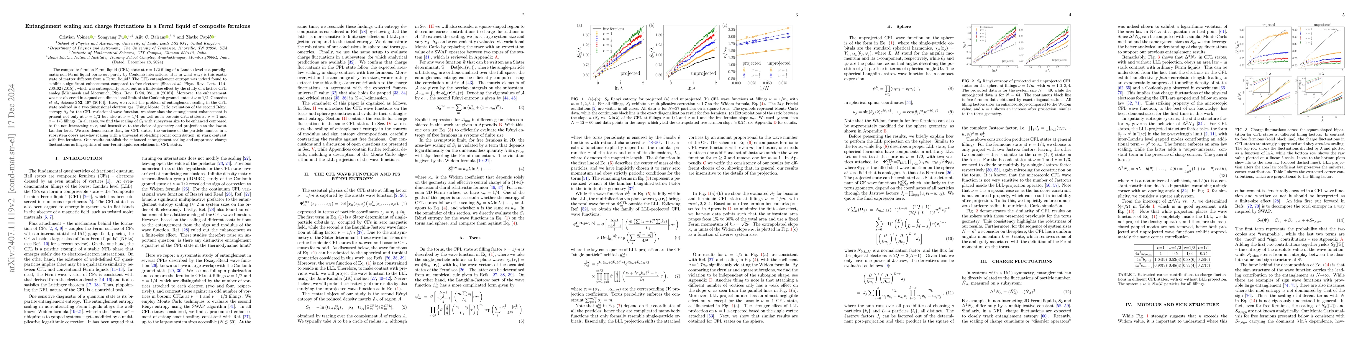 The composite fermion Fermi liquid (CFL) state at $\nu{=}1/2$ filling of a Landau level is a paradigmatic example of a non-Fermi liquid borne out purely by Coulomb interactions. But in what ways is this exotic state of matter precisely different from a Fermi liquid? The entanglement entropy of the CFL state was indeed found to exhibit a significant enhancement compared to free electrons [Shao et al., Phys. Rev. Lett. 114, 206402 (2015)], which was subsequently ruled out as a finite-size effect by the study of a lattice CFL analogue [Mishmash and Motrunich, Phys. Rev. B 94, 081110 (2016)]. Moreover, the enhancement was not observed in a quasi-one-dimensional limit of the Coulomb ground state at $\nu{=}1/2$ [Geraedts et al., Science 352, 197 (2016)]. Here, we revisit the problem of entanglement scaling in the CFL state realized in a two-dimensional continuum system. Using Monte Carlo evaluation of the second R\'enyi entropy $S_2$ for the CFL variational wave function, we show that the entanglement enhancement is present not only at $\nu{=}1/2$ but also at $\nu{=}1/4$, as well as in bosonic CFL states at $\nu{=}1$ and $\nu{=}1/3$ fillings. In all cases, we find the scaling of $S_2$ with subsystem size to be enhanced compared to the non-interacting case, and insensitive to the choice of geometry and projection to the lowest Landau level. We also demonstrate that the variance of the particle number in a subsystem obeys area-law scaling with a universal subleading corner contribution, in stark contrast with free fermions. Our results establish the enhanced entanglement scaling and suppressed charge fluctuations as fingerprints of non-Fermi-liquid correlations in the CFL state.
