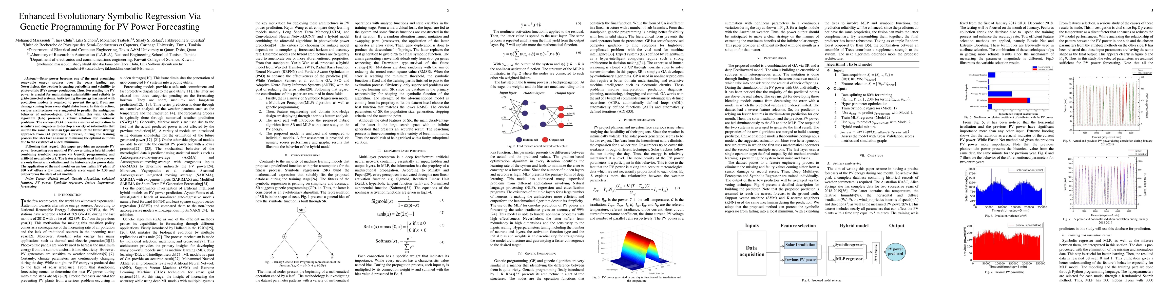 Solar power becomes one of the most promising renewable energy sources over the years leading up. Nevertheless, the weather is causing periodicity and volatility to photovoltaic (PV) energy production. Thus, Forecasting the PV power is crucial for maintaining sustainability and reliably to grid-connected systems. Anticipating the energy harnessed with prediction models is required to prevent the grid from any damage coming from every slight disturbance. In this direction, various architectures were suggested to predict the ambiguous behavior of meteorological data. Within this vein. Genetic algorithm (GA) presents a robust solution for nonlinear problems. The success of GA presents a source of motivation to scientists and engineers to develop a variety of sub-models that imitate the same Darwinian type-survival of the fittest strategy approach from GA propriety. However, during the training process, the later face an issue with missing the optimal solutions due to the existence of a local minimum. Following that regard, this paper provides an accurate PV power forecasting one month of PV power using a hybrid model combining symbolic regressor via Genetic programming and artificial neural network. The features inputs used in the process are only the solar irradiation and the historical solar power data. The application of the said model on an Australian PV plant of 200 kW offers a low mean absolute error equal to 3.30 and outperforms the state of art models.