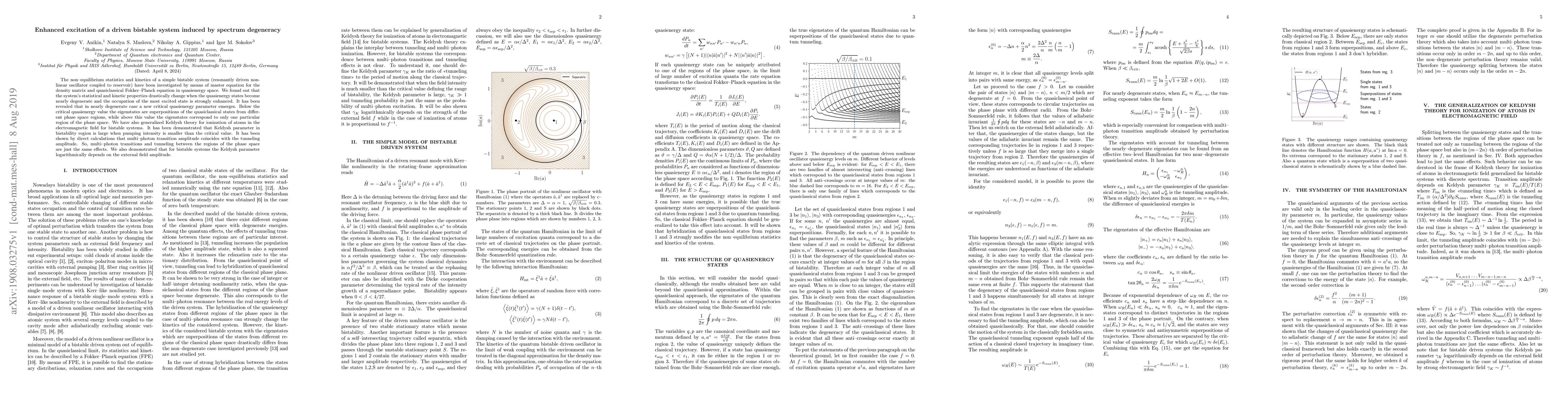 The non-equilibrium statistics and kinetics of a simple bistable system (resonantly driven nonlinear oscillator coupled to reservoir) have been investigated by means of master equation for the density matrix and quasiclassical Fokker-Planck equation in quasienergy space. We found out that the system's statistical and kinetic properties drastically change when the quasienergy states become nearly degenerate and the occupation of the most excited state is strongly enhanced. It has been revealed that in nearly degenerate case a new critical quasienergy parameter emerges. Below the critical quasienergy value the eigenstates are superpositions of the quasiclassical states from different phase space regions, while above this value the eigenstates correspond to only one particular region of the phase space. We have also generalized Keldysh theory for ionization of atoms in the electromagnetic field for bistable systems. It has been demonstrated that Keldysh parameter in bistability region is large when pumping intensity is smaller than the critical value. It has been shown by direct calculations that multi-photon transition amplitude coincides with the tunneling amplitude. So, multi-photon transitions and tunneling between the regions of the phase space are just the same effects. We also demonstrated that for bistable systems the Keldysh parameter logarithmically depends on the external field amplitude.