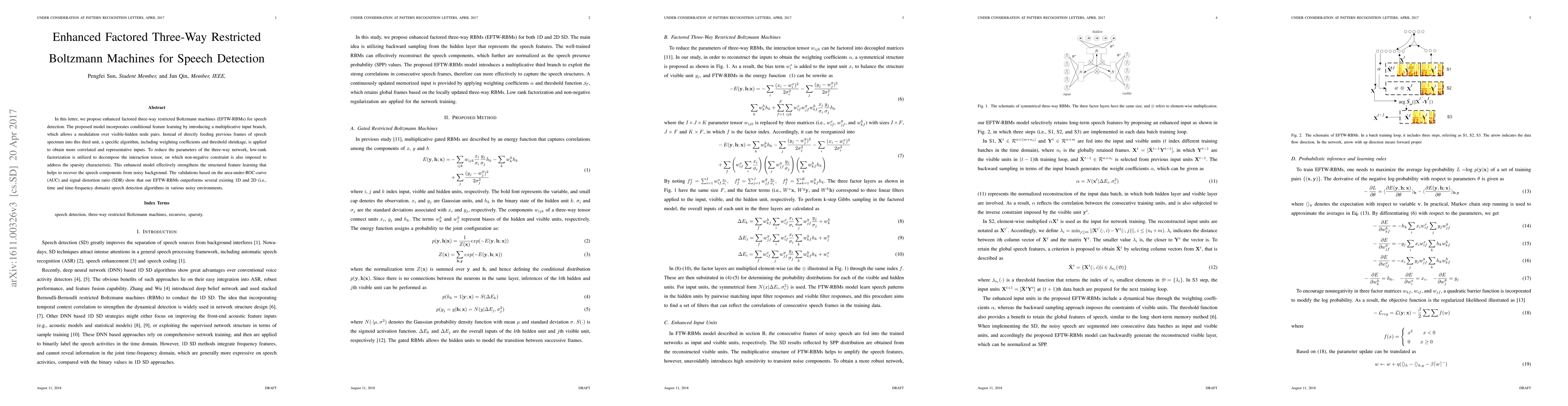 In this letter, we propose enhanced factored three way restricted Boltzmann machines (EFTW-RBMs) for speech detection. The proposed model incorporates conditional feature learning by multiplying the dynamical state of the third unit, which allows a modulation over the visible-hidden node pairs. Instead of stacking previous frames of speech as the third unit in a recursive manner, the correlation related weighting coefficients are assigned to the contextual neighboring frames. Specifically, a threshold function is designed to capture the long-term features and blend the globally stored speech structure. A factored low rank approximation is introduced to reduce the parameters of the three-dimensional interaction tensor, on which non-negative constraint is imposed to address the sparsity characteristic. The validations through the area-under-ROC-curve (AUC) and signal distortion ratio (SDR) show that our approach outperforms several existing 1D and 2D (i.e., time and time-frequency domain) speech detection algorithms in various noisy environments.