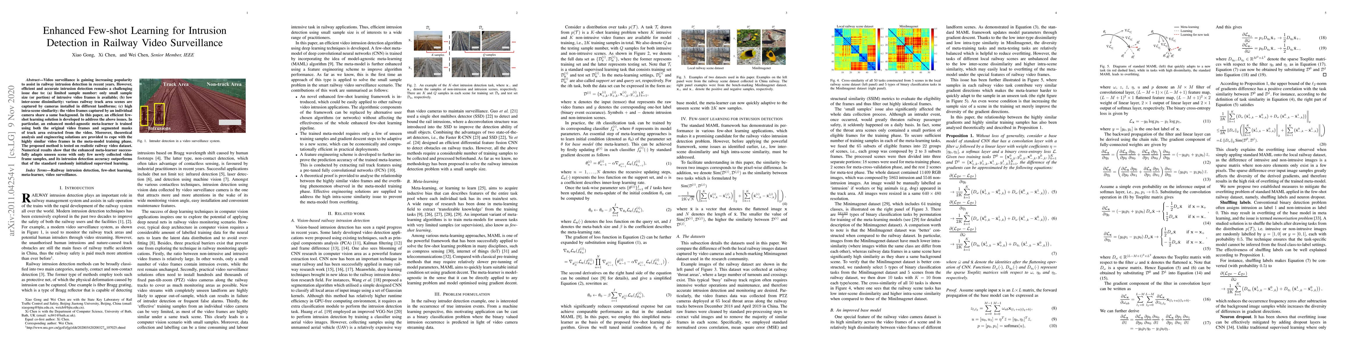 The paper proposes an enhanced few-shot learning solution for railway video intrusion detection using a model-agnostic meta-learner trained on original video frames and segmented track area masks. It addresses challenges like limited sample size, low inter-scene dissimilarity, and high intra-scene similarity in railway video surveillance.
