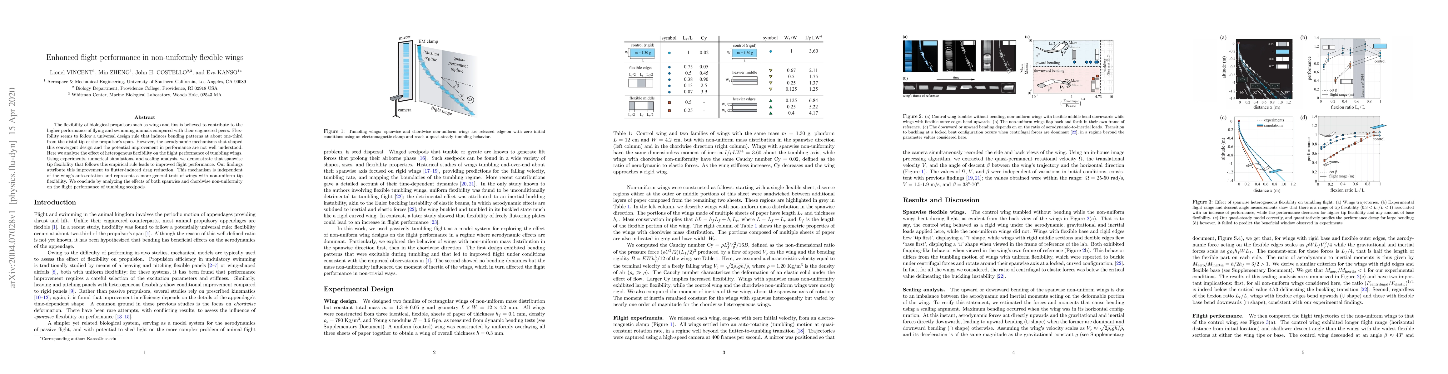 The flexibility of biological propulsors such as wings and fins is believed to contribute to the higher performance of flying and swimming animals compared with their engineered peers. Flexibility seems to follow a universal design rule that induces bending patterns at about one-third from the distal tip of the propulsor's span. However, the aerodynamic mechanisms that shaped this convergent design and the potential improvement in performance are not well understood. Here we analyze the effect of heterogenous flexibility on the flight performance of tumbling wings. Using experiments, numerical simulations, and scaling analysis, we demonstrate that spanwise tip flexibility that follows this empirical rule leads to improved flight performance. Our findings attribute this improvement to flutter-induced drag reduction. This mechanism is independent of the wing's auto-rotation and represents a more general trait of wings with non-uniform tip flexibility. We conclude by analyzing the effects of both spanwise and chordwise non-uniformity on the flight performance of tumbling seedpods.