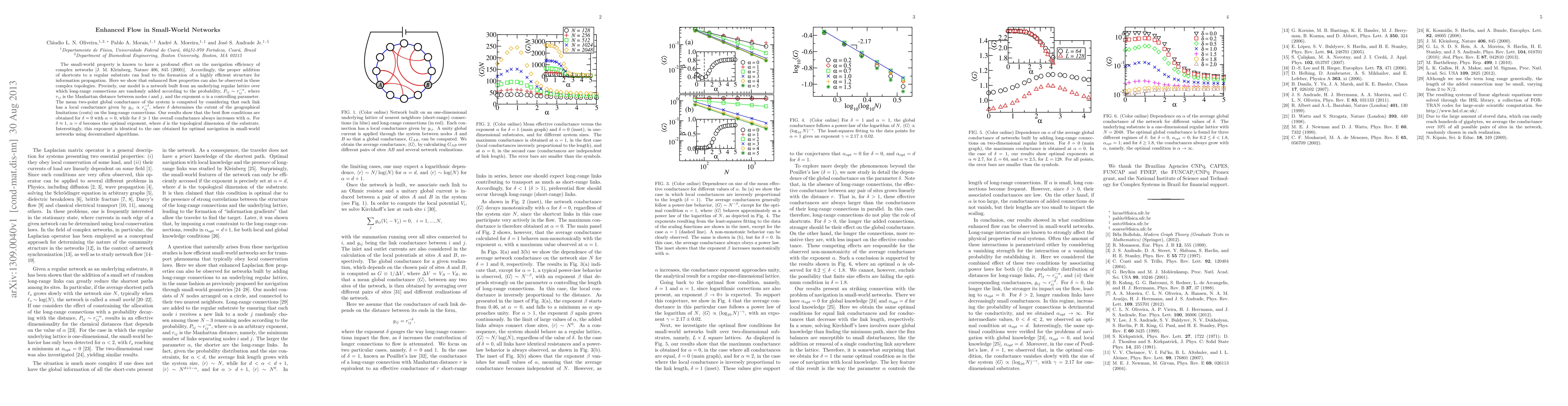This paper explores the enhanced flow properties in small-world networks formed by adding long-range connections to a regular lattice. The optimal flow conditions are found when the exponent governing the connection probability matches the network's topological dimension, mirroring the optimal navigation exponent in small-world networks.