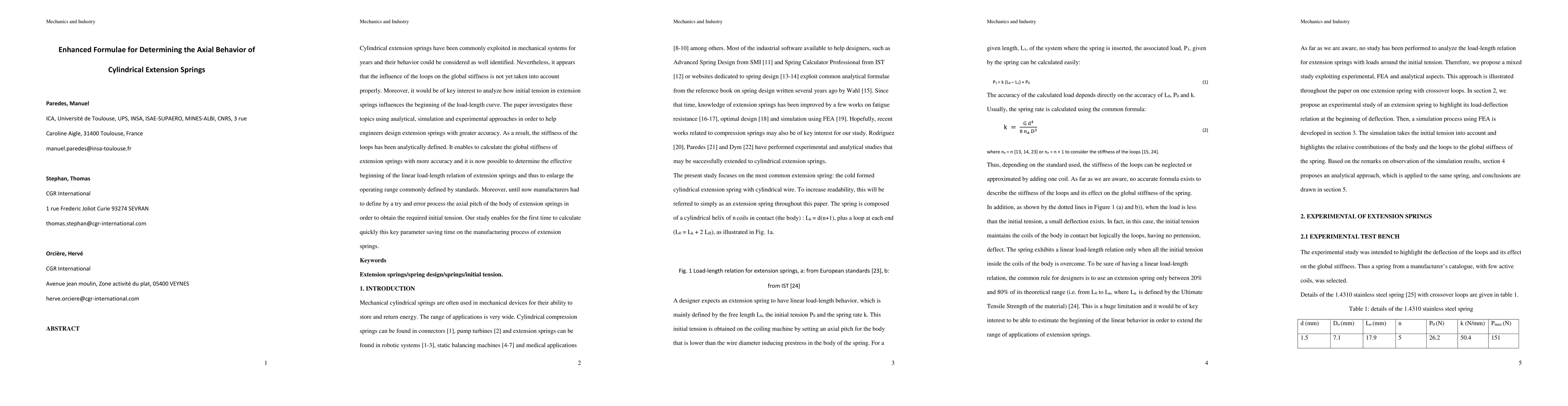 Cylindrical extension springs have been commonly exploited in mechanical systems for years and their behavior could be considered as well identified. Nevertheless, it appears that the influence of the loops on the global stiffness is not yet taken into account properly. Moreover, it would be of key interest to analyze how initial tension in extension springs influences the beginning of the load-length curve. The paper investigates these topics using analytical, simulation and experimental approaches in order to help engineers design extension springs with greater accuracy. As a result, the stiffness of the loops has been analytically defined. It enables to calculate the global stiffness of extension springs with more accuracy and it is now possible to determine the effective beginning of the linear load-length relation of extension springs and thus to enlarge the operating range commonly defined by standards. Moreover, until now manufacturers had to define by a try and error process the axial pitch of the body of extension springs in order to obtain the required initial tension. Our study enables for the first time to calculate quickly this key parameter saving time on the manufacturing process of extension springs.