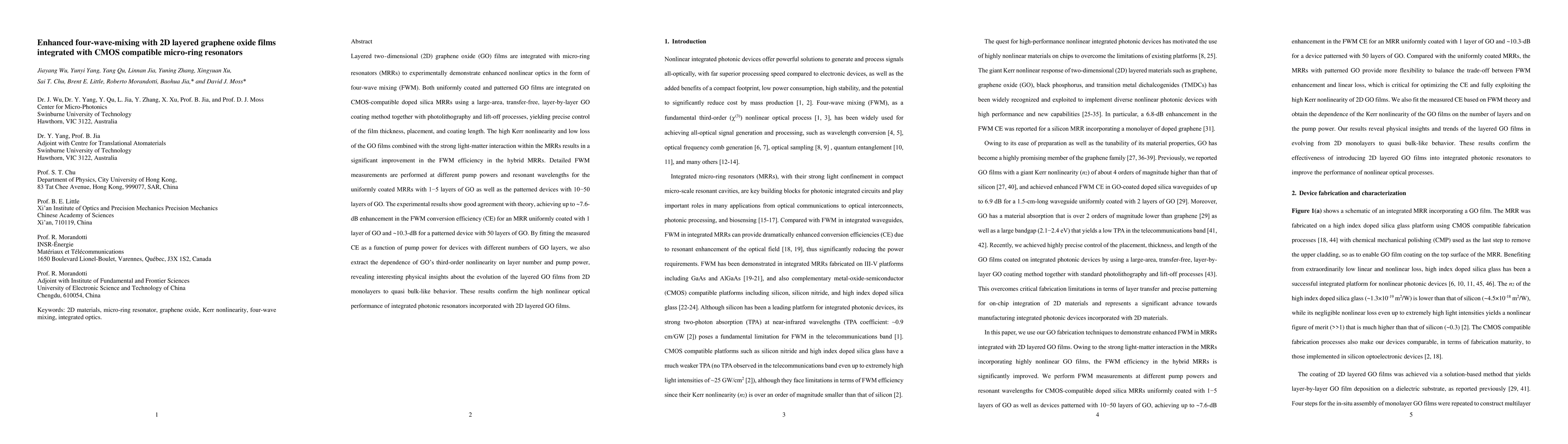 This research demonstrates enhanced four-wave mixing (FWM) in CMOS compatible micro-ring resonators (MRRs) integrated with layered 2D graphene oxide (GO) films, achieving up to 10.3 dB improvement in FWM efficiency. The study reveals physical insights into the evolution of GO films from 2D to quasi-bulk behavior.