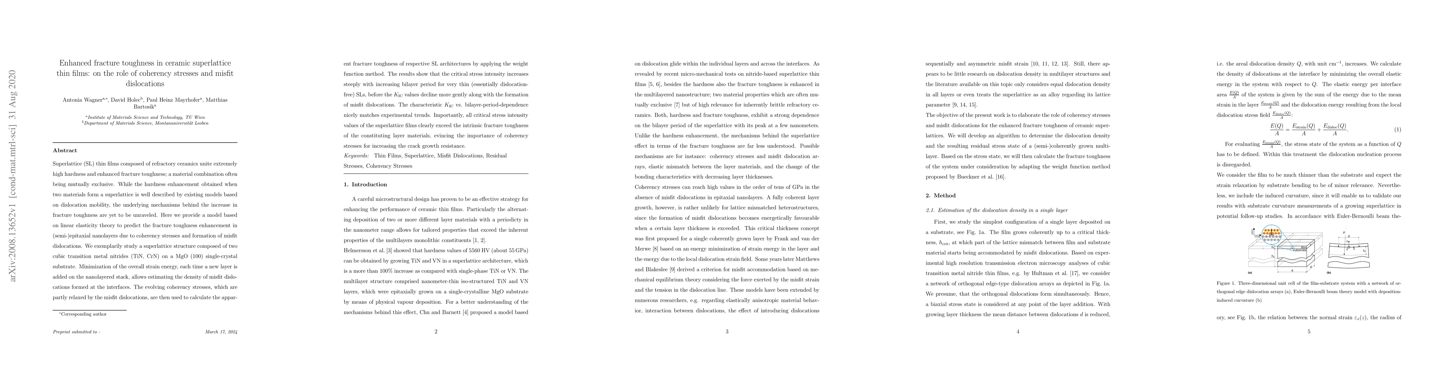This research proposes a model explaining enhanced fracture toughness in ceramic superlattice thin films through coherency stresses and misfit dislocations. It demonstrates that critical stress intensity increases with bilayer period, particularly for thin superlattices, and exceeds the intrinsic fracture toughness of individual materials, highlighting the role of coherency stresses in improving crack resistance.