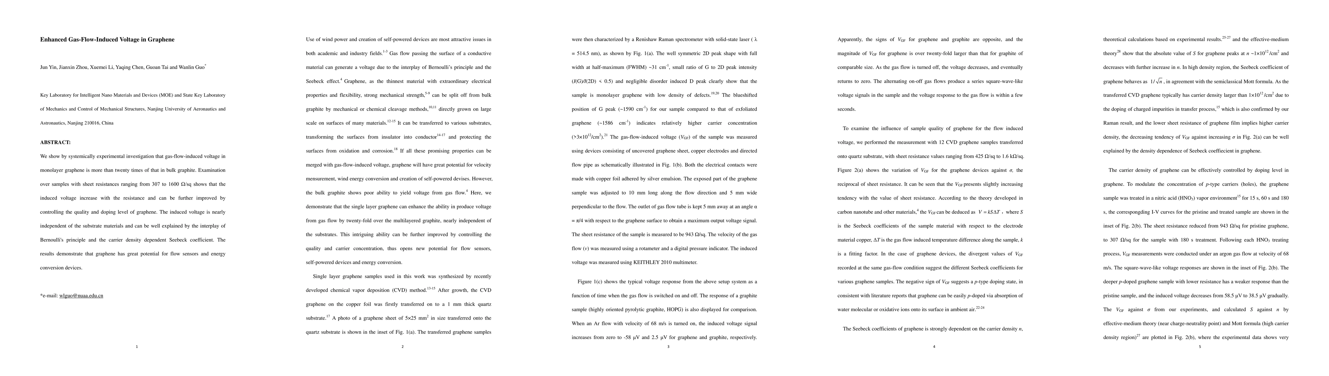 We show by systemically experimental investigation that gas-flow-induced voltage in monolayer graphene is more than twenty times of that in bulk graphite. Examination over samples with sheet resistances ranging from 307 to 1600 {\Omega}/sq shows that the induced voltage increase with the resistance and can be further improved by controlling the quality and doping level of graphene. The induced voltage is nearly independent of the substrate materials and can be well explained by the interplay of Bernoulli's principle and the carrier density dependent Seebeck coefficient. The results demonstrate that graphene has great potential for flow sensors and energy conversion devices.