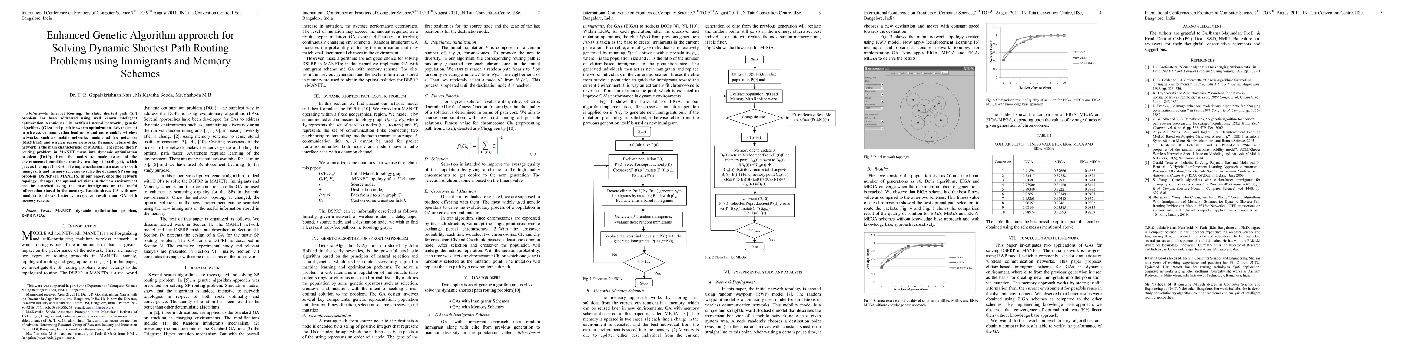 This paper proposes an enhanced genetic algorithm incorporating immigrants and memory schemes to solve dynamic shortest path routing problems in mobile ad hoc networks (MANETs). The approach uses new immigrants and stored memory to adapt to changing network topologies, demonstrating better convergence with the former method.