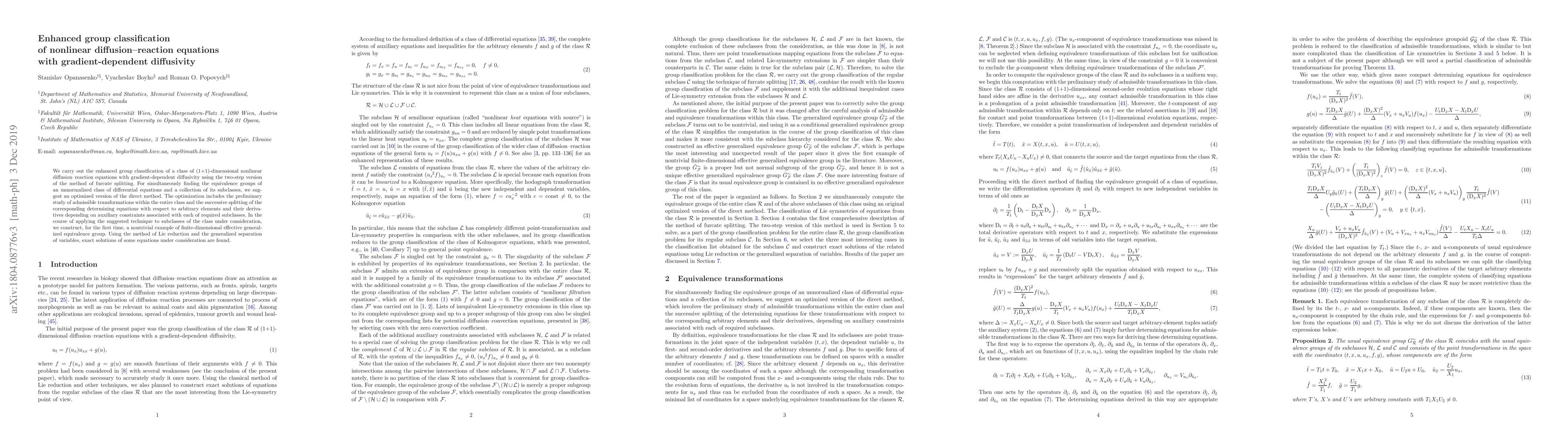 This paper presents an enhanced group classification of nonlinear diffusion-reaction equations with gradient-dependent diffusion using an optimized version of the direct method. It constructs a nontrivial example of a finite-dimensional effective generalized equivalence group and finds exact solutions via Lie reduction and separation of variables.