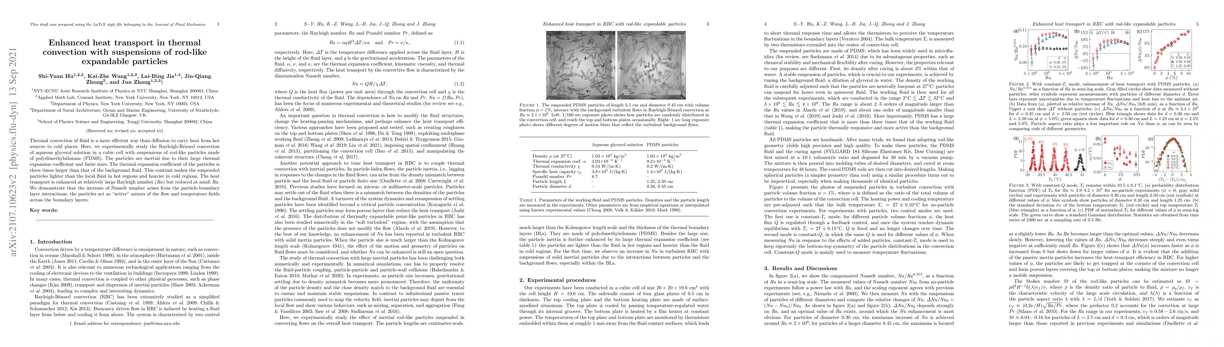 This study experimentally investigates enhanced heat transport in Rayleigh-Bénard convection using suspensions of rod-like expandable PDMS particles in glycerol solution. The particles' large thermal expansion coefficient induces buoyancy changes, enhancing heat transport at high Rayleigh numbers due to active mixing effects.