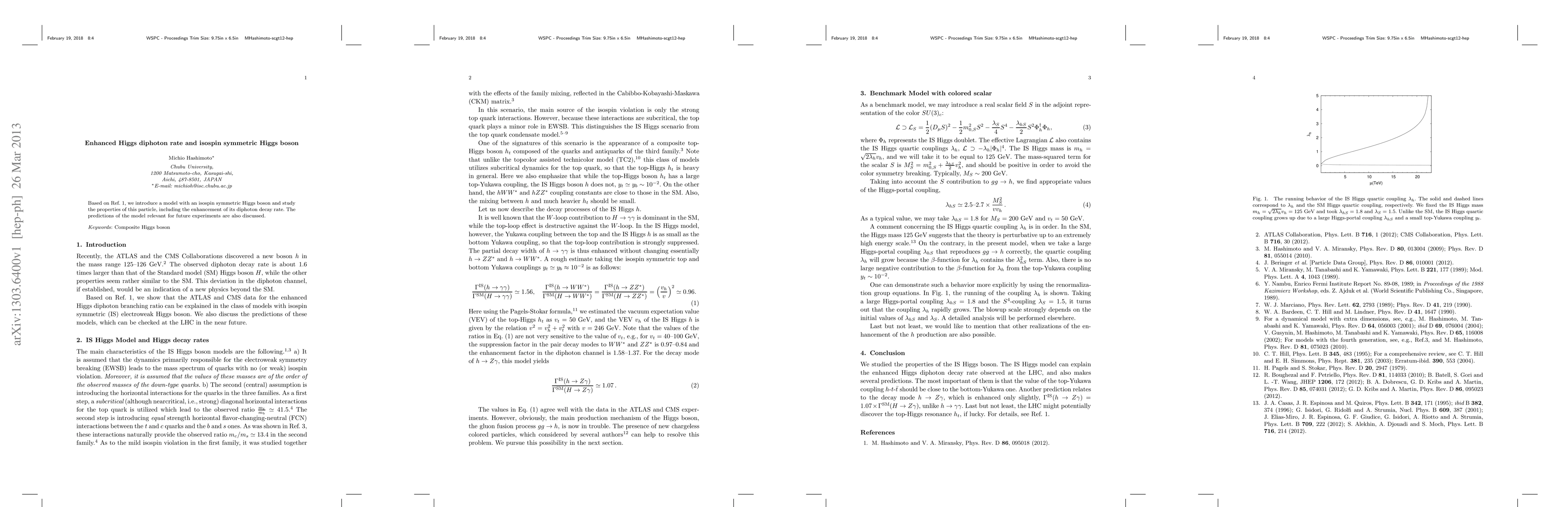 This paper proposes a model featuring an isospin symmetric Higgs boson that enhances the diphoton decay rate, with implications for future experimental predictions. The study discusses the particle's properties and potential experimental verification.