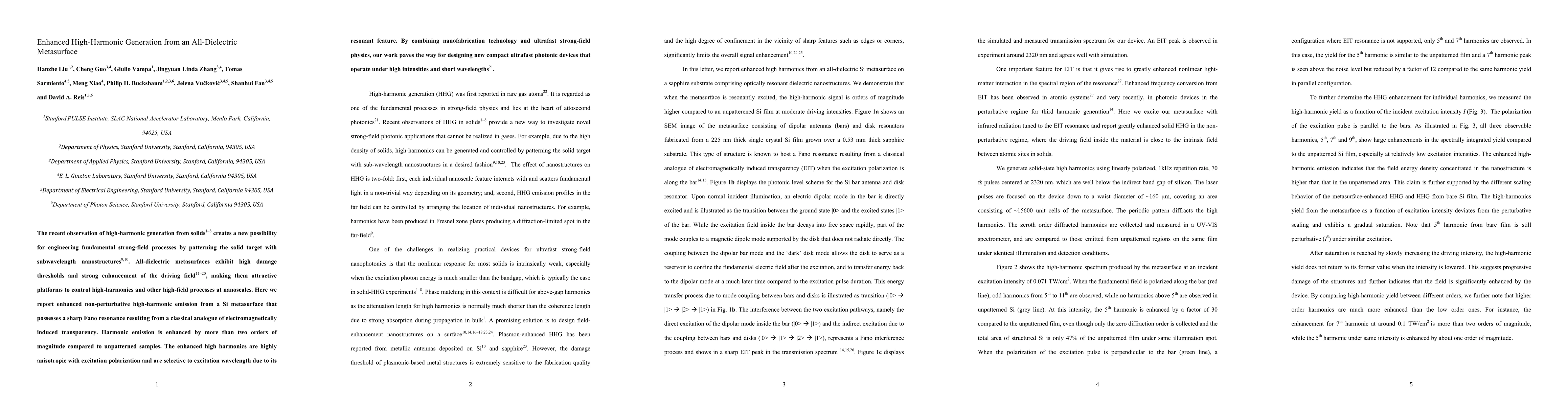 This paper reports significantly enhanced high-harmonic generation from a Si metasurface with a sharp Fano resonance, achieving over two orders of magnitude increase compared to unpatterned samples, paving the way for advanced compact ultrafast photonic devices. The anisotropic and selective enhancement is attributed to the metasurface's resonant properties.