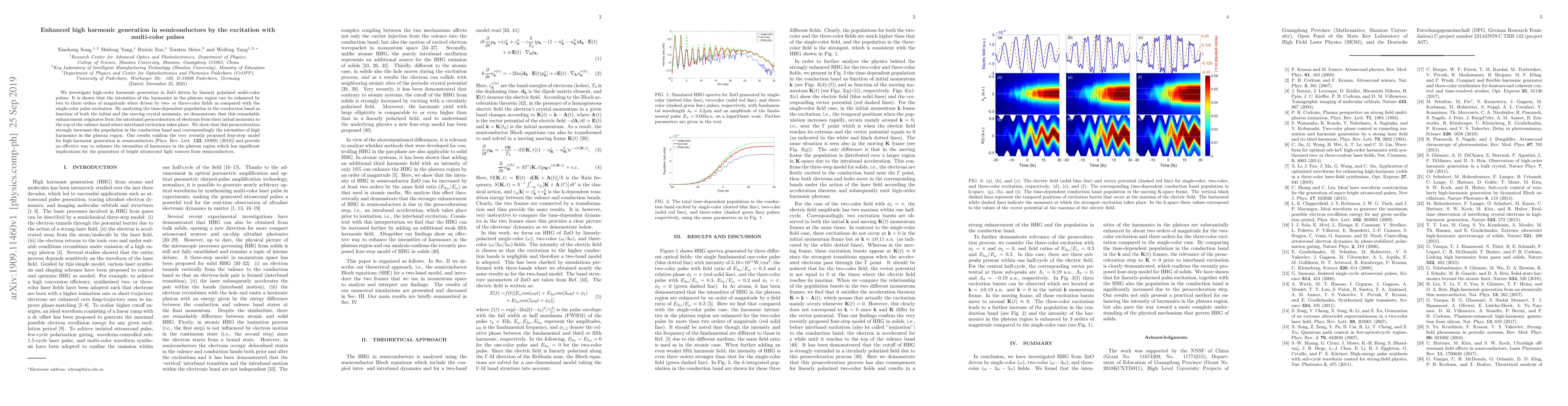This paper demonstrates that high harmonic generation in ZnO can be enhanced by two to three orders of magnitude using multi-color pulses compared to single-color pulses. The enhancement is attributed to intraband preacceleration of electrons, which increases conduction band population and harmonic intensities, confirming the four-step model for semiconductor harmonic generation.