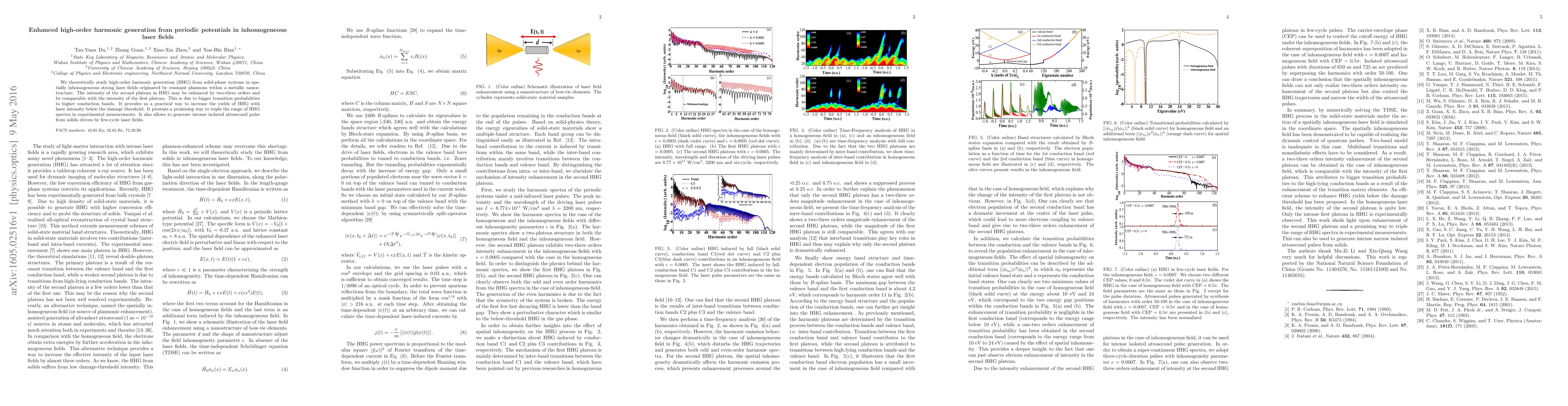 We theoretically study high-order harmonic generation (HHG) from solid-phase systems in spatially inhomogeneous strong laser fields originated by resonant plasmons within a metallic nanostructure. The intensity of the second plateau in HHG may be enhanced by two-three orders and be comparable with the intensity of the first plateau. This is due to bigger transition probabilities to higher conduction bands. It provides us a practical way to increase the yields of HHG with laser intensity below the damage threshold. It presents a promising way to triple the range of HHG spectra in experimental measurements. It also allows to generate intense isolated attosecond pulse from solids driven by few-cycle laser fields.
