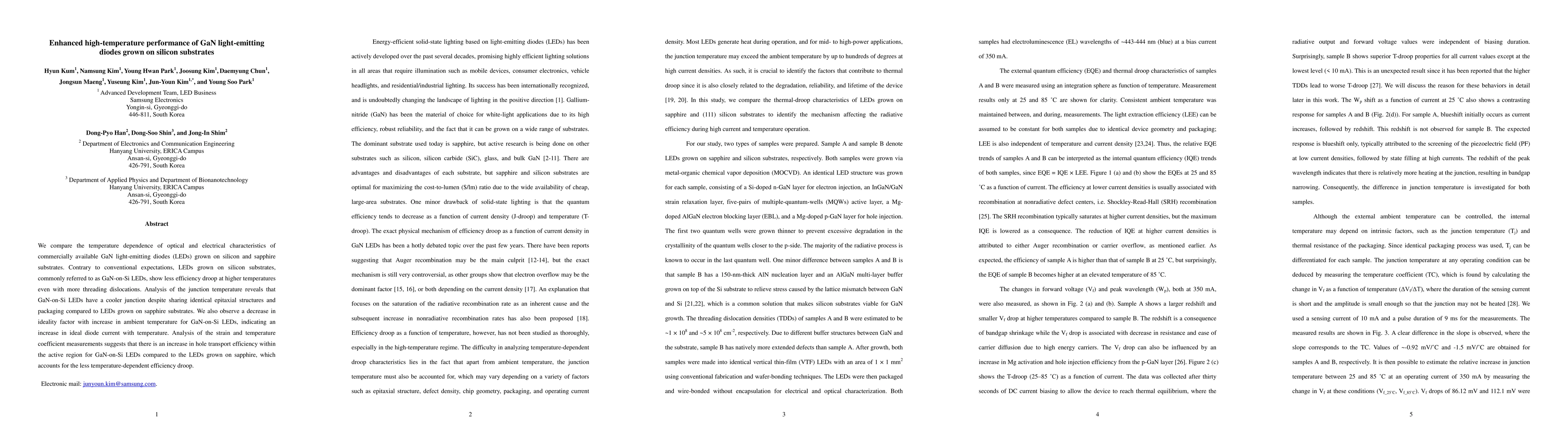 This study finds that GaN LEDs grown on silicon substrates exhibit less efficiency droop at high temperatures compared to those on sapphire, despite higher dislocation densities. The cooler junction temperature and increased hole transport efficiency in GaN-on-Si LEDs suggest improved performance at elevated temperatures.
